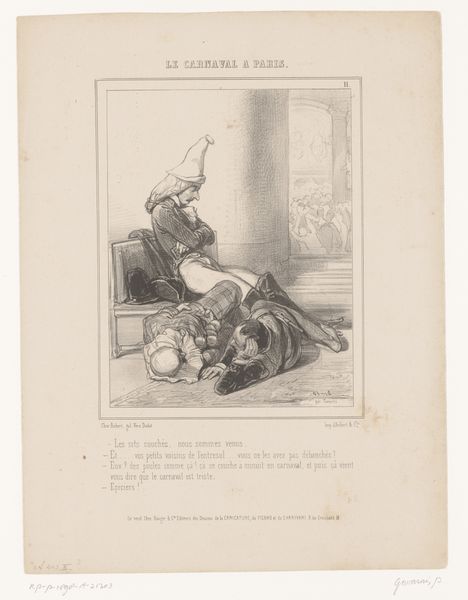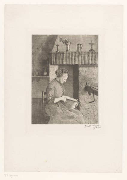 Curator: Looking at Henri Boutet's 1885 etching and lithograph, "Vrouw haalt een prent uit een portfolio" – A Woman Takes a Print from a Portfolio—I’m immediately struck by the almost overwhelming sense of intimacy. What’s your take? Editor: My eye goes straight to the stack of prints and the portfolio itself. Look at the size! It makes me think about the physical labor, the craft involved in producing and handling these large-scale printed materials in that era. Curator: Absolutely! I love the little details. Notice how she holds her glasses – you know, as if trying to scrutinize it closer without putting them on? There is so much quiet reflection. Almost voyeuristic! Like she is so consumed by the artworks, nothing else matters. Editor: It also makes me think about access, right? Who got to handle art this way? Was she a collector, a dealer, or perhaps someone working directly with the printer? The portfolio becomes a marker of status, revealing a world of artistic consumption for the elite. And it really prompts thinking on class and gender issues. Who produces, who consumes and owns the artwork? Curator: Exactly, it hints at a whole world, like one glimpse through a keyhole, you see. You imagine who that dog she’s looking at may be and where the location depicted inside the other frames in the background might lead. In essence, art as portals to another life, a stolen glimpse from your own. Editor: It's also worth noting Boutet’s chosen medium. Etching and lithography allowed for relatively mass production, so while the original drawing is unique, the prints could be distributed more widely than, say, an original painting. A smart approach! But mass production, still within limited, bourgeois contexts. Curator: Indeed. I wonder if Boutet considered the implications of a woman, so engrossed, sifting through art this way. Did he wish to evoke her privilege? There’s a vulnerability in the moment, like she is at her purest while relating to other’s art. Editor: It makes me want to turn around, and rummage through the archive now. Look for markings, the paper's provenance and its social trajectory of making and owning! Curator: Me too, let’s investigate together sometime soon.