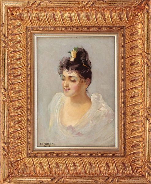 Curator: So lovely—a perfect example of intimate Romanticism. We're looking at "Young Woman with Black Hair" by Silvestro Lega. The piece resides in a private collection, and given the medium, oil paint on canvas, I'd say it exemplifies his embrace of Realism within that broader movement. Editor: Oh, she’s giving me serious Pre-Raphaelite vibes! There's such delicate detail in her face. The way she's positioned—almost floating amidst the blooms—is dreamlike and ethereal. The flowers framing her are kind of intense against that soft white fabric and her wistful gaze. Curator: Agreed. The work does play with that sense of heightened beauty so emblematic of the Pre-Raphaelites, but Lega's emphasis on observed reality separates him in a way. He wasn’t aiming for symbolic narratives as much as he was after truthful depiction and observation. What is interesting is how Realism and Romanticism are merging with such personal themes. Editor: Yes, I can feel that. Those roses definitely enhance the femininity but not in the stereotypical way. They aren't stiff, showy blossoms, but have more life, slightly imperfect in their arrangement. There’s something about how they soften the geometry of the oval frame too, that I really appreciate. The red ribbon on her hair adds such a striking, intimate detail. Do you get a sense that she is deep in thought about something, contemplating an intimate world and moment of interiority? Curator: Most definitely! Think about how portraiture was evolving. While academic painting showcased idealised and mannered features, there was this desire to use paint in representing how society was embracing a world moving towards industrialisation, depicting people that felt both intimate and ordinary, without artifice, in a way that democratised beauty and showed emotion as key for engaging the viewer. Editor: That really adds another layer. Looking again, I notice even the almost photographic precision to those petals...but without losing that almost hazy atmosphere that I still perceive here. There is definitely a modern kind of sadness in her expression too. It gets me wondering what her real-life circumstances may have been. Curator: It prompts considerations regarding Lega’s own social standing and relationship to the materials— the pigments he acquired, the canvases he employed, the artistic circles within which he moved to produce art as commodity… Her anonymous beauty, perhaps is more universal now due to those historical circumstances in fact. Editor: In a strange way. You have helped reveal a profound truth, that indeed she could be everyone, now.