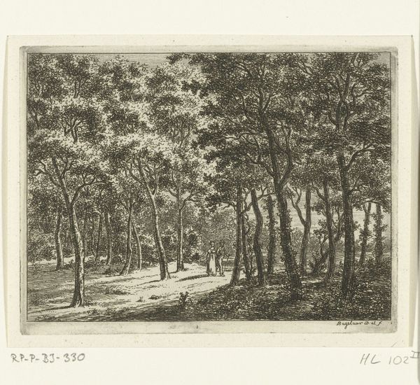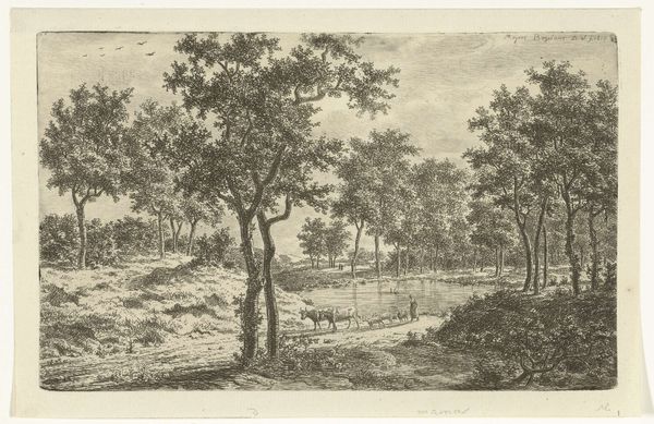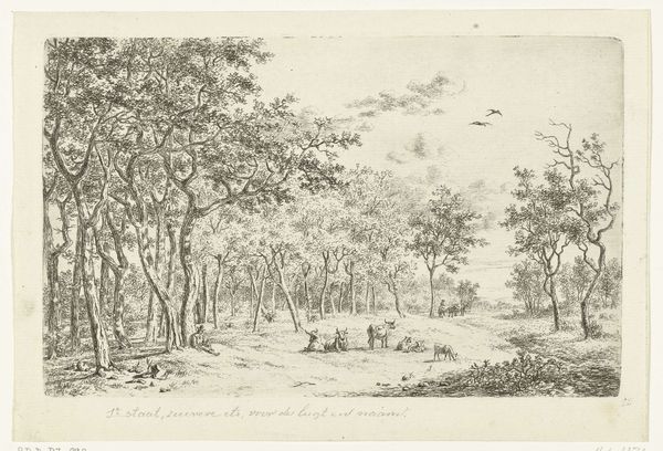 Ernst Willem Jan Bagelaar created this etching, "Herder met koe in het bos," capturing a shepherd with a cow in the woods. The landscape is rendered with an intricate network of lines, creating a dense, almost overwhelming sense of natural space. Notice how Bagelaar uses line to delineate the forms of the trees. The density of these lines creates a textural contrast between the foreground and background. This tension between detail and form is very interesting. The figures are secondary to the trees. They seem almost absorbed by the natural environment. The composition invites us to consider the relationship between humanity and nature. Are we separate from it or part of a continuum? The formal qualities of the etching—its starkness and detail— invite a deeper engagement with the philosophical ideas of the sublime. This artwork uses these elements to prompt introspection on our place within the broader ecological framework.