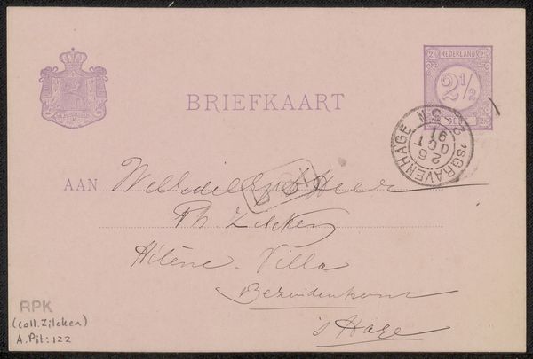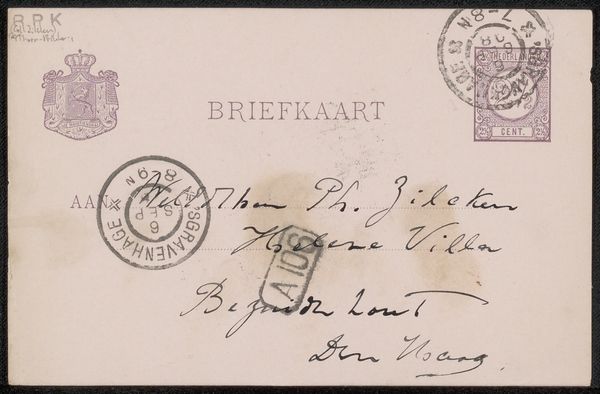 Curator: We're looking at "Briefkaart aan Philip Zilcken," a drawing with ink on paper by Tony Lodewijk George Offermans, created before 1894. It is, quite simply, a postcard. Editor: What strikes me immediately is how intimate it feels. A relic from another era when a quick note meant ink, penmanship, and a tangible connection. It looks so fragile. I imagine these paper and ink must age pretty rapidly? Curator: The drawing encapsulates post-impressionistic ideals, as represented in the spontaneous and gestural application of ink, and also the immediacy of its creation. What kind of reading might we discern in the layout and formal elements present in it? Editor: The composition is strikingly formal, actually. The placement of the crest, stamp, and handwriting creates a delicate asymmetrical balance. Look at how the curve of the address mirrors the curve of the postmark stamp! There’s an elegance even in its utility, a functional poetry to the lines, swooshes and all. But it all contrasts the crest…the only real picture on it. What statement did that add to a written note? Curator: Indeed. Observe the semiotic relationship between the crest and handwriting to communicate the intention of this drawing. Offermans leverages graphic weight to reinforce meaning while conveying information. Do you feel this portrait alludes to personal, social, or creative factors influencing the artwork? Editor: Absolutely, I think the combination suggests a person of stature reaching out, sharing something perhaps confidential but certainly crafted with care. It gives this small piece the feeling of containing secrets and importance. Did Zilcken reply? Curator: Intriguing speculation! Considering Offermans's technical command evident in this paper ephemera, there lies value in its careful visual syntax to unlock hidden meaning and narratives behind its graphic format. Editor: In the end, it is more than just an old postcard, isn't it? It is a tiny window into a past relationship.