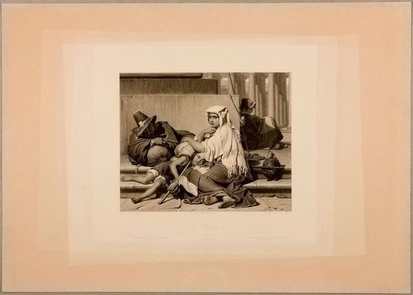 Curator: Jules François created this engraving, titled "Pelgrims rustend bij de Sint Pieter te Rome" in 1847. What strikes you about it at first glance? Editor: Well, the contrast is compelling. The vulnerability of the sleeping pilgrims huddled at the base of what appears to be Saint Peter's Basilica creates an immediate emotional impact. It’s quite melancholic. Curator: Absolutely. Consider the labour behind this print; the fine lines, the precise gradations achieved through engraving on metal. Each mark represents countless hours and decisions, all geared toward evoking that emotion in the viewer. Note how such skilled artisanship elevates genre painting within the artistic hierarchy. Editor: It goes beyond mere craftsmanship. The slumped postures and worn clothing of the pilgrims—they’re carrying a lot of weight, not just physically but symbolically. Their attire signals their origin and devotion, yet the basilica looms as a distant, almost indifferent, backdrop. Curator: That distance speaks volumes. Pilgrimage was arduous work. The print invites us to think about how their devotion intertwines with material reality: what clothes do they wear, what tools do they carry, and how does their journey affect them? Editor: The woman gazing out from the group seems particularly important. She isn't asleep like the others, and her gaze is quite penetrating, engaging the viewer directly. Perhaps she embodies resilience or hope, essential elements in the larger narrative of pilgrimage? Curator: Perhaps the print functioned almost like a social document. Engravings, widely disseminated, brought images of the poor and itinerant into middle-class homes. This highlights the relationship between art, labor, and consumption. How might people have responded to the image back then? Editor: By translating devotion into an easily circulated print, its imagery gains lasting cultural weight. Beyond mere depiction, "Pelgrims rustend bij de Sint Pieter te Rome" encapsulates the intersection of faith and earthly existence. Curator: Indeed. Looking at it this way has reinforced my appreciation for both the process of creating such a beautiful piece and its commentary on 19th-century social structures. Editor: And I find that exploring its iconography offers us insight into timeless human aspirations of meaning and belonging. It's a privilege to delve into how symbols retain their relevance across generations.