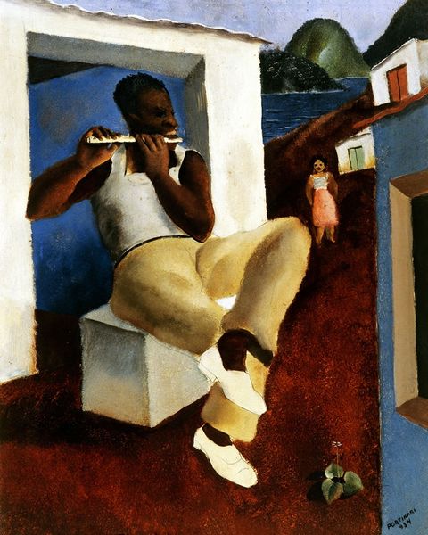 Curator: Welcome. We are looking at Norman Lewis’s "Girl With Yellow Hat" from 1936. It’s an oil on canvas portrait, showcasing a figure in repose. Editor: Immediately, I feel a sense of quiet melancholy. She’s hidden beneath that broad hat brim, almost shielding herself from the world. It’s a very introverted painting, wouldn't you agree? Curator: Indeed. Painted during the interwar period, the work can be understood within a broader artistic trend where artists explored interiority and psychological states. Lewis, later known for his abstract expressionism, shows a sensitivity to figurative representation here. It's a painting made at a time when Black artists were pushing against prescribed tropes. Editor: Absolutely. The limited palette also speaks volumes – muted tones, punctuated only by the brightness of the hat. It's like the hat is a symbol of a fleeting joy, contrasted with the more somber mood of the rest of the scene. Is it joy or maybe defiance? Curator: One could certainly interpret it that way. Looking at his wider oeuvre and considering Lewis’s involvement in the Harlem art scene, there’s a subtle dialogue occurring about visibility, representation and perhaps even the performance of identity. The hat may offer a layer of anonymity but at the same time suggests agency on the sitter’s part. Editor: It makes you wonder about the story behind that hidden face. Is she contemplative, weary, or something else entirely? What secrets does she carry? Curator: The fact that we are left wondering is precisely the point. Unlike conventional portraiture, it prompts questions instead of providing answers. The painting resists simple readings, and is open for conversation. Editor: Well, that makes me think maybe there is hope underneath that big bright hat, after all! Maybe not melancholy, just pensiveness. I've changed my mind, again! Curator: Ultimately, “Girl with Yellow Hat” demonstrates Lewis's early engagement with portraying nuanced emotions and experiences. It remains a compelling piece for discussion today. Editor: A captivating glimpse into a moment suspended in time, where we find the unspoken stories the most intriguing, indeed!