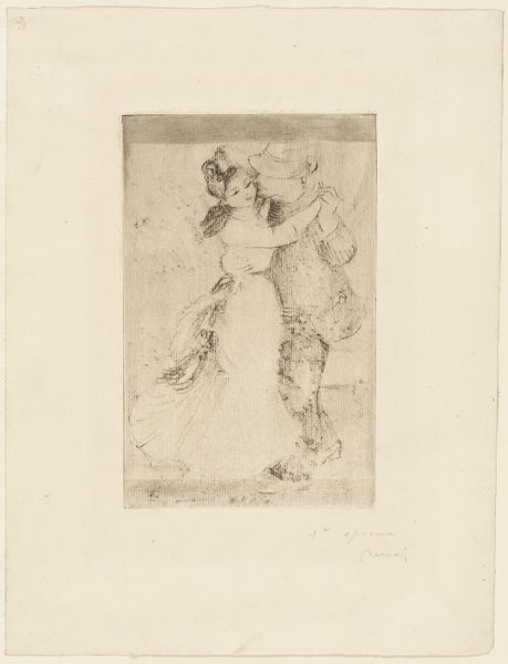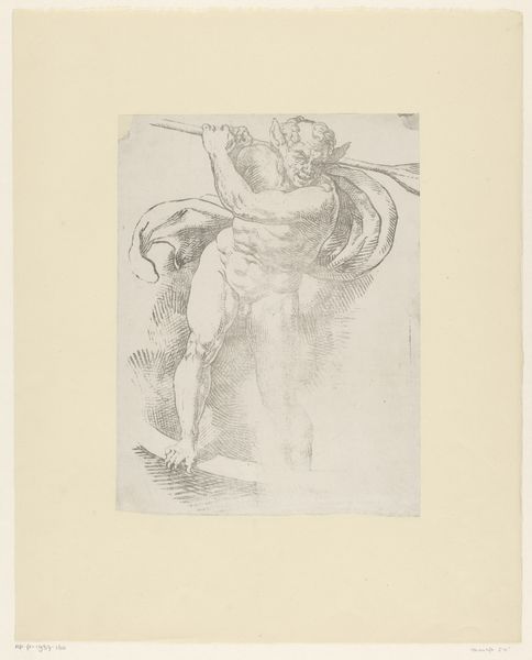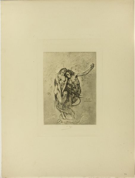Felicien Rops created this etching, "Warrior," likely in the late 19th century, using a copper plate to produce this print. Consider the labor involved: Rops would have meticulously drawn the image onto the metal surface with needles and acids, line by line. This demanding process allowed for the creation of multiple impressions, democratizing access to art but also raising questions about originality and value. The stark monochrome and fine lines of the etching emphasize the warrior's form and the haunting quality of the piece. The effect is starkly different from the immediate visibility of a painting, requiring the viewer to actively engage and discover its subtleties. Ultimately, Rops' choice of etching is essential to understanding his artistic intent, blurring the lines between reproduction and unique artistic expression and prompting us to consider art's role within a wider context of production and consumption.