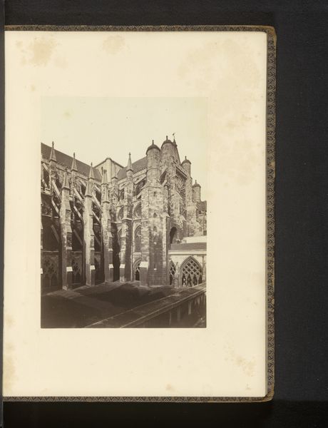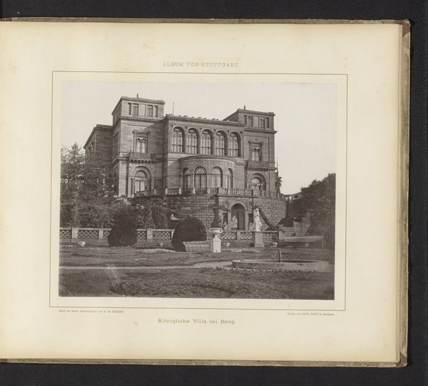This is E. Durand's "Gezicht op Château de Vassy in Étaule, Frankrijk", a monochrome print where the imposing architecture of the château dominates the composition. The interplay of light and shadow across the textured surfaces of the building evokes a sense of gravitas. Durand masterfully uses contrasting elements to convey his message. The geometric precision of the château's facade is juxtaposed with the organic overgrowth of ivy that softens its edges. This contrast destabilizes traditional notions of architectural dominance, hinting at the relentless forces of nature reclaiming what was once rigidly defined. The stark monochrome palette emphasizes the structural forms and the interplay of light, drawing our attention to the meticulous details etched into the surface. Through his handling of light, texture, and composition, Durand invites us to contemplate the shifting dynamics between human-made structures and the natural world. What appears as a straightforward depiction of a château subtly questions fixed meanings and hierarchies.