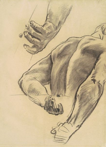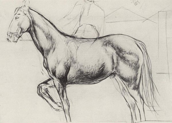 Editor: This is "Sketch for the Painting Bathing the Red Horse" by Kuzma Petrov-Vodkin, made in 1912. It's a charcoal drawing, a preliminary study. There's such a sense of contained power in the musculature the artist renders. What can you tell me about this piece? Curator: This sketch resonates deeply within its historical context. 1912—Russia teetering on the brink of immense social and political upheaval. Consider the symbolism of the red horse, a motif pregnant with interpretations of fate, of Russia’s destiny. How do you think Petrov-Vodkin uses the animal form to speak about this tension? Editor: It feels prophetic, a looming force that can’t be controlled. The red horse, particularly, could be representative of war or revolution. But why a horse, specifically? Curator: The horse has long been a potent symbol across cultures, linked to power, virility, and even death. By presenting it in red, Petrov-Vodkin evokes a sense of urgency, perhaps even violence. Remember too, this was a period of burgeoning avant-garde movements—a deliberate break from academic traditions. The sketch aesthetic is raw, not striving for photo-realism, but expressing emotion. Do you see that reflected here? Editor: Absolutely. The sketchiness amplifies the feeling of unease, as if the future itself is unfixed, still in formation. Curator: Precisely. And think about who is bathing this horse – are they in control, or at its mercy? It challenges the traditional, often patriarchal, depictions of humans dominating nature. Instead, the act of bathing becomes fraught with this tension. What does this juxtaposition reveal? Editor: That art acts like a mirror. I guess it reflected anxieties that may have already existed at that time. The Red Horse is an interesting projection of the unknown to come. Curator: Precisely. This sketch, a seemingly simple drawing, offers a window into a complex interplay of artistic, social, and political anxieties. It compels us to grapple with Russia's historical narrative. Editor: I see so much more now. Thanks!
