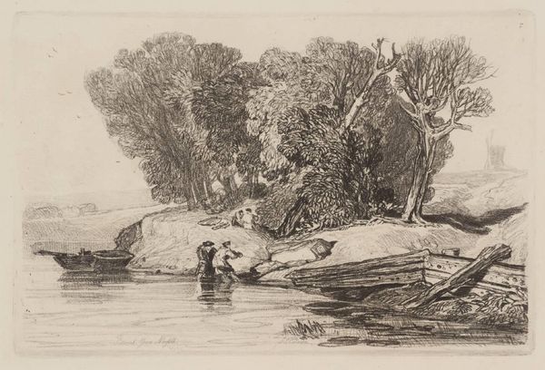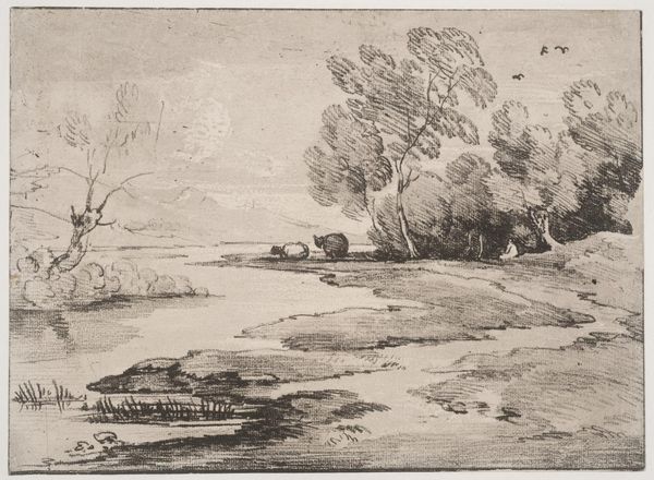Curator: This is William James Müller's "Glen Martin Mill, Porlock" from 1835, currently held in the Tate Collections. Editor: It has a subdued, almost melancholic feel. The stark monochrome lends a sense of distance, wouldn't you agree? Curator: Quite. Müller was fascinated by the intersection of labor and landscape. Notice how the mill is both picturesque and a site of production. The materiality of that humble structure speaks volumes of rural life. Editor: Agreed, but the composition is also key. The way the lines of the landscape draw your eye toward the mill, emphasizing its importance within the scene, and the limited palette concentrates your view on contrasts in texture and form. Curator: And it's vital to consider the socioeconomic context. Müller was documenting a disappearing way of life with industrialization looming. Editor: True, but the beauty of the work rests on the strength of its forms. Curator: Ultimately, it's a stark reminder of the forces shaping rural existence. Editor: Yes, and a beautiful study in the subtleties of tone and composition.