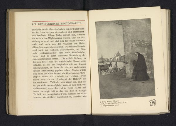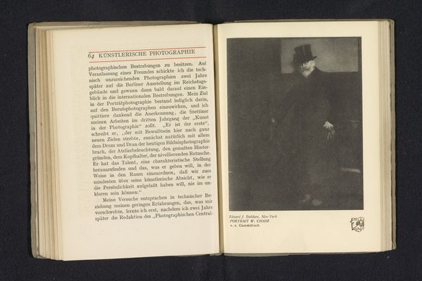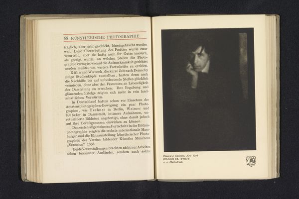 This is a photographic reproduction of an image by Clarence H. White, depicting an interior with a woman seated, likely produced in the early 20th century. It is printed on a page in a book, next to a text in German discussing artistic photography. The image itself creates meaning through the interplay of light and shadow, a stylistic choice that connects it to the Pictorialist movement. This movement aimed to elevate photography to the status of fine art through soft focus, and the careful arrangement of elements within the frame. Given White's involvement with the Photo-Secession, an organization that challenged established artistic norms, this photograph likely aimed to contest the view of photography as a purely documentary medium. Instead, it proposes photography as a vehicle for artistic expression, similar to painting or drawing. To understand this image better, research into the writings of Photo-Secession members and the critical reception of Pictorialist photography is essential. It would shed light on the artistic debates of the time, and the social conditions that influenced the production and reception of art.