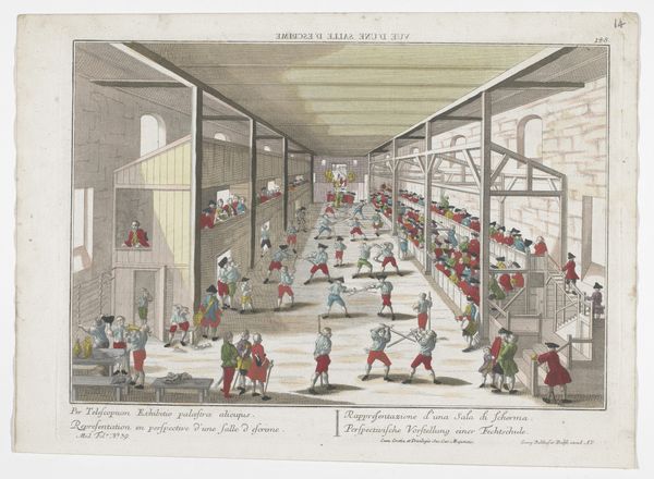 Editor: This print, “Gezicht op een toernooischool,” made sometime between 1742 and 1801 by Georg Balthasar Probst, depicts an elaborate tournament scene. The image feels so staged, with these almost doll-like figures neatly arranged. What social narratives are embedded in a work like this? Curator: I see a carefully constructed image, certainly. We can view it as more than a straightforward depiction of a tournament, but as a reflection of the social hierarchies and power dynamics of the period. The staged quality you observe, and the rigid arrangements, are important visual cues that this wasn't just entertainment. This was about reinforcing social roles. Who has access to the upper tiers of seating? What sartorial signifiers indicate social standing? Editor: The red coats do stand out among the spectators. Curator: Exactly. These colors, the clothing styles, the presence and absence of certain groups – all contribute to understanding who is participating in, and who is excluded from, this performance of power. How might the individuals in the audience interpret this display? Editor: I imagine for those in positions of authority, seeing it validated is reassuring, but for those excluded or relegated to the lower echelons, it must reinforce their marginalized status. A stark visualization of their social position. Curator: Precisely. The 'performance' in the ring dictates how society is ordered in space, confirming each person's position. By analyzing what is seen we see past the event to the politics behind it. Does this prompt new perspectives on the work for you? Editor: Absolutely. Seeing it as a staging of societal structure makes it much more than just a historical record of a tournament. I never thought about an art piece “ordering society”. Thanks! Curator: It's been my pleasure to explore this with you. The past speaks volumes if we're willing to listen critically.