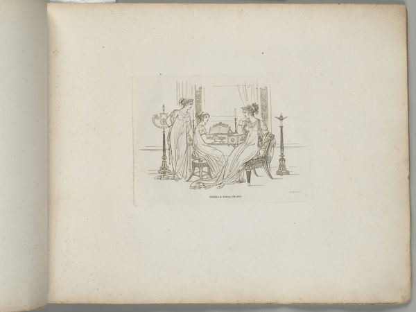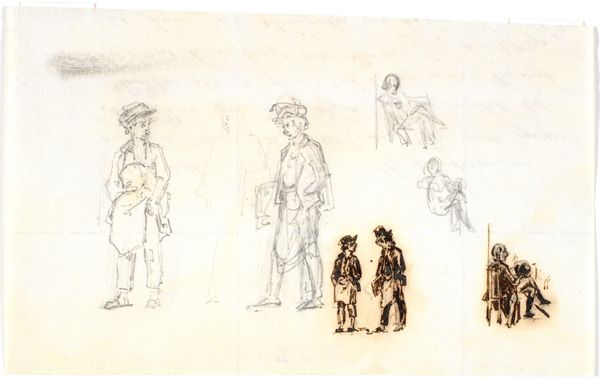Curator: Here we have Martinus Rørbye's "Interiør med dansende figurer," dating back to 1832. It’s a pencil and colored pencil drawing on paper. Editor: My initial reaction is a sense of wistful melancholy. Despite the dancing figures, there's an unfinished quality, almost ghostly. The lightness of the lines and the muted tones contribute to a dreamlike atmosphere, a captured memory rather than a lively scene. Curator: That sense of "captured memory" resonates with me. This work exists in the context of burgeoning nationalism across Europe and Denmark grappling with its identity following the Napoleonic Wars. The artwork, a sketch almost, conveys this search. Rørbye later in his career, also captured images in cultures to its east, and in so doing brought new views of class, power and identity. Editor: Fascinating. I'm drawn to the subtle repetition of circular forms. The hanging vessels—are they gourds, perhaps?—echo the curves of the dancers' arms and skirts, creating a visual rhythm. I wonder if these repeated circular motifs are intended to signify community, cycles of life, even eternity? Curator: Potentially. Also we cannot discard the notion of performance that's deeply ingrained within certain social circles—class played an important role, with dancing lessons symbolizing both sophistication and aspiration. Think of a need to see oneself performing appropriately to be seen as valuable by society. This is especially poignant considering the societal expectations placed upon women within those spaces. Editor: That performance aspect rings true when considering social expectation. But there's a vulnerability in this depiction. These are unfinished figures, existing on a liminal space of the paper. It’s as if the act of dance is revealed, only for an instance in its movement. Is that where the dream lies? Curator: I think so, especially given the historical understanding of women in social life. Even a sense of forced expectations placed onto people within specific genders during the time. A ghost of dance, just a memory of a touch. Editor: Rørbye's sketch truly offers an intriguing view, a study of both societal forces, a ghostly dance—a captivating insight into memory and fleeting moment. Curator: Yes, an important point, how this seemingly light sketch allows us to understand a moment in time as it interlocks with cultural weight.