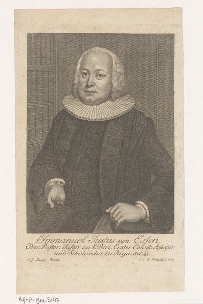 Editor: Here we have David Herrliberger's "Portret van Johann Caspar Ulrich," made sometime between 1715 and 1768. It's a baroque portrait created as an engraving. I'm really struck by the tight composition. It feels very formal and contained, but also incredibly detailed for a print. What do you see in this piece, focusing on its artistic construction? Curator: The artist has established a strong sense of visual hierarchy. The sharp lines that delineate the central figure are in stark contrast with a background of near uniform texture. The figure's collar almost leaps from the surface. Note also the strong geometric patterns in the lower frame, providing structure and stability beneath the effusive personality of the man above. Editor: That contrast is really interesting. The geometric lines make the elaborate ruff around his neck look almost... playful, against such severe geometry. But why emphasize structure so explicitly within a portrait? Curator: Structure, in formalist terms, underscores the artwork's status as art. The rigorous use of line and form invites us to appreciate Herrliberger’s mastery. Consider how the framing device not only isolates the portrait, but reiterates geometric structures within the image itself. It invites contemplation about the artifice, the making of this image. Editor: I see! So the content, the 'who' of the portrait, almost takes a back seat to how it's made, how it's structured as an image. Curator: Precisely. Editor: That really changes how I see portraiture. I tend to think of the subject first, but this makes me consider the formal choices so much more. Curator: Paying attention to this artwork’s construction heightens its visual dynamism and reveals sophisticated meaning-making.