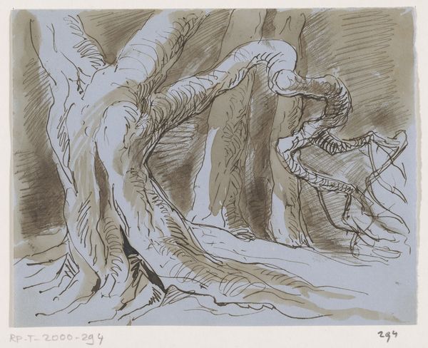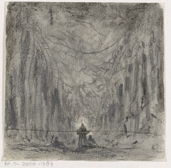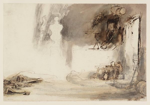 Curator: I'm immediately struck by the way the light barely touches the scene. It's somber, a bit daunting. Editor: That’s right, what we're looking at is "Druipsteengrot," which roughly translates to "Dripstone Cave." It's a drawing rendered with ink, watercolor, and pencil, made sometime between 1841 and 1865 by Petrus Johannes Schotel. It resides here at the Rijksmuseum. Curator: Schotel really captures the cave's mysterious atmosphere. It's like peeking into a hidden world. Look at the small figures; they seem so insignificant compared to the scale of the rocks and stalactites. Editor: Indeed, there’s a clear manipulation of scale at play, underscoring a sense of sublime awe mixed with slight terror. Consider how the dripping water is suggested through simple, vertical lines, echoing the Romanticism prevalent at the time. It also bears elements of realism, striving for factual representation rather than sheer embellishment. Curator: It feels like I’m standing at the threshold of something unknown, both terrifying and exhilarating. I’d be interested to hear sounds when viewing this, sounds of nature like dripping water and echoed voices. It amplifies that primal connection we have with nature. Editor: An evocative perspective. We can also note how Schotel's expert use of tonal variation brings depth and volume to the cavernous space, creating a tangible, almost palpable, sense of depth. He masterfully orchestrates a play of dark and light, creating strong chiaroscuro effects typical of Romantic landscape drawing. Curator: It pulls us into a world that feels both ancient and timeless, don't you think? And look closely at that little figure standing within the depth. Is it Schotel perhaps? Or maybe a reference to Caspar David Friedrich’s "Wanderer"? Editor: The artist seems more focused on depicting the physical phenomena and objective experience of space, the weight of geological formations, and the interplay of light and shadow within such an enclosure. I would argue that Schotel is probably less preoccupied with injecting existential or metaphorical significance into this work. Curator: Hmm, maybe you’re right. Regardless, it inspires a sense of wonder and encourages a deeper appreciation for the Earth's hidden artistry. Editor: I agree. It showcases not only the external spectacle, but also an intriguing lens through which the 19th-century viewer encountered the natural world, mediating perception with artistic skill and intent.