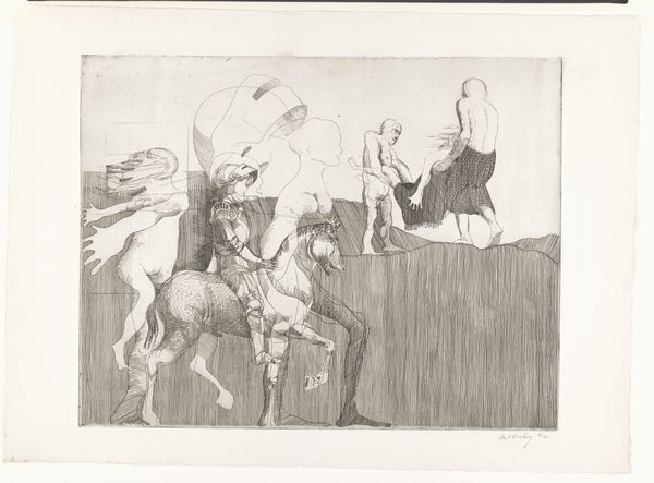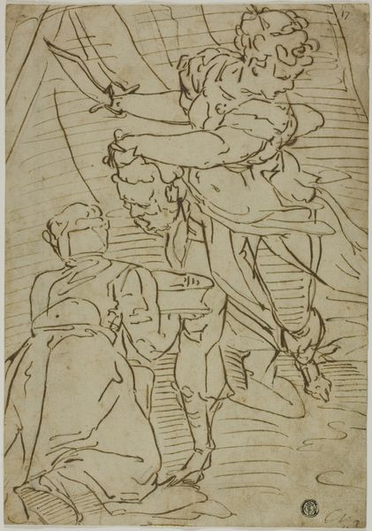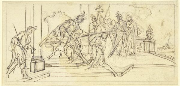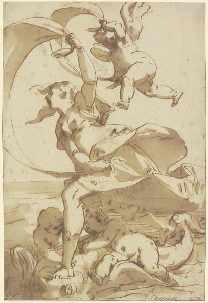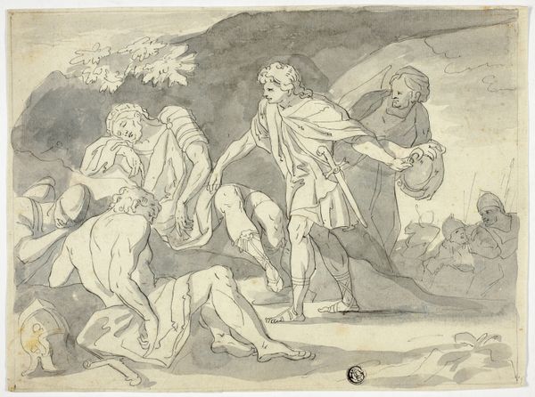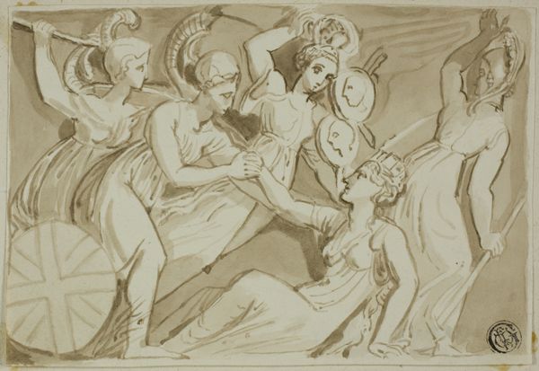 Thomas Stothard created this wash drawing, "Angel Placing Wreath on Head of Dying Soldier," sometime between the late 18th and early 19th centuries. Born in London, Stothard would have been keenly aware of the era’s shifting social and political landscape. His art often reflected the prevailing ideals of heroism, sacrifice, and national pride amidst near constant warfare. Here, an angel bestows a wreath upon a dying soldier, anointing him with glory in his final moments. The soldier's body is supported by comrades, creating a tableau of masculine camaraderie. The emotional intensity is palpable, underscored by the ethereal presence of the angel. While seemingly celebrating valor, the image also hints at the human cost of war, with the dying soldier representing countless unacknowledged sacrifices. The angel and wreath serve as a symbol of absolution, transforming the brutal reality of death into a moment of transcendence. This reflects both the cultural glorification of military service and the deeply personal grief experienced by those left behind.