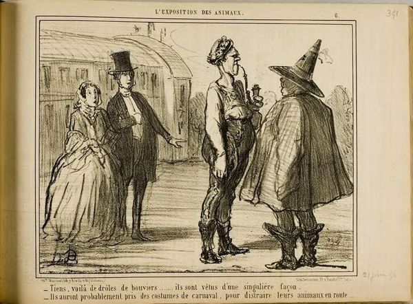 Curator: Daumier's lithograph, "Ah, here are some cows that have bodies without legs!", skewers societal absurdities. What strikes you most about its satirical commentary? Editor: I'm intrigued by how he uses animal imagery to critique human behavior. It feels pointed, but what exactly is he targeting? Curator: Consider the context: 19th-century France, a society obsessed with appearances and industrial progress. Daumier uses these legless cows as a metaphor, perhaps for the dehumanizing effects of industrialization or the superficiality of the bourgeoisie. Editor: So, he’s using humor to highlight a serious social critique? Curator: Precisely. The exaggeration and irony serve to expose the perceived flaws and contradictions within the social and political landscape. Editor: I see. The figures almost seem like caricatures themselves. This really opens my eyes to the power of satire in art. Curator: Indeed. Daumier compels us to reflect on how societal structures shape identity and experience.