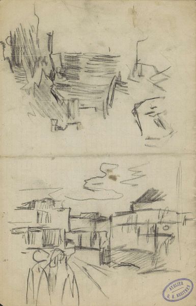 Editor: This is "Stadsgezicht en een knielende figuur," a drawing by George Hendrik Breitner, made around 1885. It looks like a quick sketch in pencil, a fleeting impression. What can you tell us about it? Curator: What immediately strikes me is the *labor* involved, both Breitner’s and, perhaps more importantly, the subject’s. This is not a grand, finished history painting meant for a salon; it's a sketch, raw, immediate. It shows a glimpse into the process – the materiality of the pencil on paper capturing a worker, perhaps in prayer or in labor itself, kneeling against the backdrop of a city under construction. What was Breitner trying to *do* here? Editor: So you're thinking about the action and the tools? The contrast is certainly visible! Curator: Exactly. Think about the paper he's using – a readily available, cheap material versus the precious metals and canvases often associated with “high art”. It's about production, reproduction and the role of the artist as a recorder of the everyday, even the toiling. The *social* realities embedded in even a humble sketch, especially one like this produced in the rapidly industrializing Netherlands. Does this rawness detract, do you think? Or does the immediacy amplify the work? Editor: I can see how its incompleteness speaks to the labor. It shows a moment in time, like it couldn’t be contained in the space of that paper. It speaks of the effort without a final statement, so in that regard it seems to add power to it, yes. Curator: The act of sketching becomes almost performative then. The rapid lines, the suggestive shapes. I wonder what the broader social commentary is intended to show about laborers. Editor: Looking at it from this point of view does give you insight on an everyday experience. I now see the artistic practice from the sketchbooks into completed work, not something from "high art."
