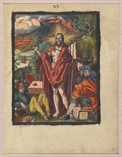 Editor: This is "Saint Mark" by Hans Collaert the Elder. It's an engraving housed at the Harvard Art Museums. It's quite small but intricate! I'm struck by how the composition is arranged within these circular and rectangular frames. What do you see in this piece? Curator: Note the plate's dimensions: the inner rectangle centers St. Mark, while the encompassing circle with floral motifs creates a dynamic interplay. The artist utilizes color tonally to enhance the depth and symbolic resonance of the image. Editor: So, it’s the visual structure itself that carries meaning here? Curator: Precisely. The structural arrangement, symmetry, and color usage dictate our understanding, independent of any specific narrative beyond what is immediately apparent. What do you observe regarding the relationship between line and form? Editor: I see how the lines define the figures and the space around them, creating a sense of depth and volume, especially within the central panel. Thanks, I now appreciate how the artist used the dimensions of the plate to impact the viewer.