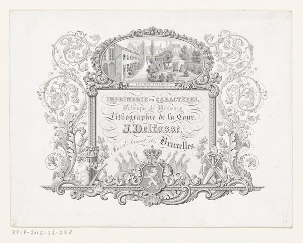 Editor: Here we have Eugène Van Maldeghem’s "Rankwerk met engelen en vrouwelijke heilige met kruis en anker" from 1849, rendered in ink on paper. I’m struck by the intricacy of the linework; it almost feels like looking at a medieval manuscript. How do you interpret this piece? Curator: I see an academic exercise steeped in the aesthetics of Romanticism, drawing heavily on formal arrangements found in illuminated manuscripts. Notice how the artist employs varied line weights and hatching to create depth and texture, despite the limited tonal range of the ink. Consider the framing: swirling vegetal forms intertwine with angelic figures. Are they purely ornamental or do they guide our reading of the central text and figures? Editor: That's interesting! It makes me think about how the artist uses the borders to draw attention to the dedication text in the center, as if creating a window into another world. The placement of the figures gives the text hierarchy, doesn't it? Curator: Precisely! Now, what about the symbolic value vested in St. Cecilia, whose name and instrument appears here in conjunction with this dedication to Monseigneur Malou? The anchor in her hand? Does the symbolism add another dimension, enriching the piece? Editor: The anchor as a symbol of hope adds a nice layer, but it does feel very ornamental overall, not really engaging beyond a pretty aesthetic. Curator: I concede the ornamental quality might seem overwhelming to the modern viewer. Yet, the artist is demonstrably invested in a formal arrangement of symbolic weight that adds depth beyond pure aesthetics. Editor: I hadn't considered it that way. It seems my initial interpretation focused on ornamentation and overlooked the layered semiotics. Curator: And I appreciate the reminder that purely formal evaluations can obscure the viewer’s subjective experience.