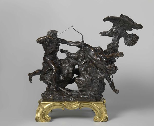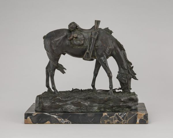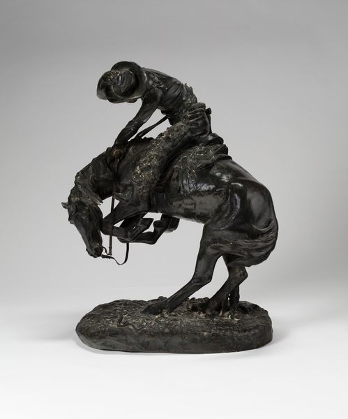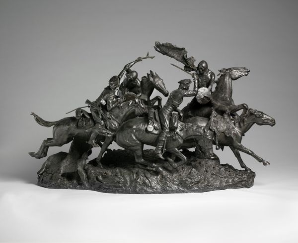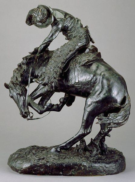 Curator: Alexander Phimister Proctor created "Indian Pursuing Buffalo" around 1916-1917. The sculpture, cast in bronze, powerfully depicts that historic scene. Editor: It strikes me as deeply kinetic. The implied movement of the horse, the hunter, and the buffalo – you can almost hear the thundering hooves and the snorts of the animals. What were his motivations? Curator: Well, Proctor's work often reflects his interest in capturing the American West. During the late 19th and early 20th centuries, there was significant public fascination with the frontier and its portrayal, partly fueled by romanticized narratives and also as a vanishing world was elegized in popular culture. He was, in a sense, responding to that social and political climate, shaping how it was visualized. Editor: The materiality seems so crucial. Bronze provides weight and permanence to a scene that was, in reality, fleeting and violent. Do we know about his method of production, the foundries involved perhaps? That texture looks exceptional. Curator: Historical records suggest Proctor typically worked with Roman Bronze Works. His sculptures reflect both naturalistic observation of wildlife and idealized representations reflecting a complex interplay of artistic intention and historical context. The heroic portrayal is tied up with issues of cultural appropriation and romanticizing colonial narratives of indigenous peoples of North America. Editor: Right, that complicates the view, doesn't it? Considering bronze’s history as a luxury material, it further transforms lived reality. We could easily reflect how the medium’s inherent qualities both reinforce the visual spectacle and underscore a market catering to privileged collectors during his time. Curator: Exactly. Viewing art requires engaging not only aesthetic dimensions but also acknowledging sociopolitical structures informing artistic creation and circulation. We can also investigate contemporary representations against changing perceptions. Editor: Seeing it like that truly deepens one's encounter with it; I appreciate thinking beyond purely an immediate visceral impact! Curator: Likewise! Analyzing it using various contexts encourages discussions concerning the intricate relationships tying art with larger historical trends.