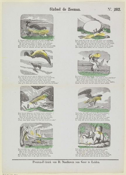 This print, titled "Sinbad de Zeeman" and created by D. Noothoven van Goor, presents us with scenes from the famed sailor's adventures. Dominating these visual narratives are potent symbols, notably the great Roc, a mythical bird of prey of immense size and strength. This majestic creature, laden with symbolic meaning, appears repeatedly throughout the series of images. We see it in multiple instances, and most strikingly, carrying an elephant in its talons. The Roc, as a symbol, reaches far back into the annals of cultural memory. We see traces of it in other mythologies, like the Garuda of Hindu and Buddhist traditions, sharing a common thread of divine power and aerial dominance. Consider how this motif of a giant bird has evolved: from a symbol of divine power to a symbol of untamed nature, laden with cultural and psychological meaning. This speaks to our collective, subconscious fascination with the wild and the unknown. It’s a cycle of imagery that reflects humanity’s emotional response to power, both terrifying and awe-inspiring, and how those primal feelings are continuously refigured through art.