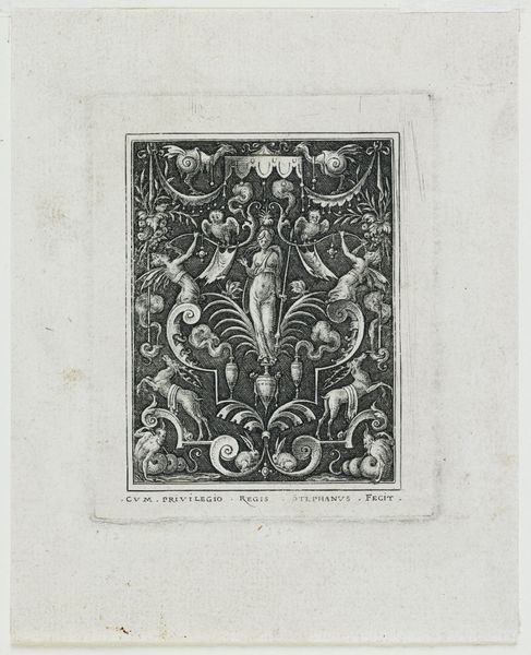Editor: This is "Mars," a pen drawing by Etienne Delaune, dating from sometime between 1528 and 1583. It's so intricate! There are so many different figures crammed into this relatively small space. What is all this imagery trying to communicate? Curator: It's a fascinating piece! Notice how the central figure of Mars, the Roman god of war, is flanked by winged putti and intertwined with elements from the natural world. This blend isn't accidental. Consider the symbolic weight of Mars: representing not just war, but also virility and protection. Now, what about those playful putti and the surrounding flora and fauna? Editor: They almost seem to soften Mars’ militaristic association… do they represent aspects of peace or maybe abundance? Curator: Precisely. The artist sets up a powerful tension between war and harmony, reflecting a broader cultural fascination with these dualities during the Renaissance. The careful arrangement suggests the desired dominance of one over the other, or even a hopeful convergence. Editor: So it’s not *just* a pretty drawing? There’s almost a political or moral statement embedded within all these figures? Curator: Yes, and more. Think about the chosen animals, the decorative vases. What do *they* evoke? Everything is deliberate. Delaune uses potent, recognisable iconography to invite the viewer to contemplate universal ideas: conflict, peace, beauty, power, transience… it’s all there, embedded in a kind of symbolic dance. Editor: Wow, I would have missed so much of that. I guess there is much more here than just the initial impression. Curator: Absolutely. Art often operates on many levels. With familiarity with its visual language we are better placed to truly understand its intent and significance.