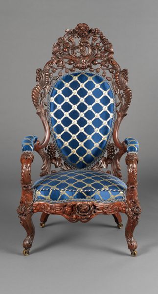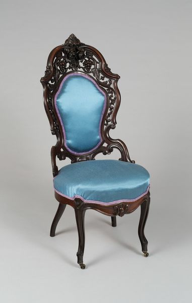 Curator: Ah, the “Slipper Chair” crafted by John Henry Belter between 1852 and 1855. An impressive display of mid-19th century Romanticism now housed at the Metropolitan Museum of Art. Editor: What strikes me immediately is the labor intensity embedded in its production—it seems an incredible feat to execute such detailed carving, an exercise that inherently blends the utilitarian object with exceptional craft. Curator: Indeed, the intricate wood carving dominates the structure and directs our eye vertically; the sweeping curves create a captivating silhouette, don't you agree? Notice how Belter’s skill creates depth within the back, the openwork appearing almost lacelike. Editor: Yes, I’m thinking of the unseen artisans behind its manufacture. How were the materials sourced, and what were the workshop conditions like? The decorative elements, the grape vines and floral motifs, seem to romanticize nature, but I'm interested in the human element required to bring this image into being. Curator: These recurring natural motifs elevate the chair beyond mere furniture; it ventures into the realm of fine art. Consider the choice of wood and its effect on our perception; its deep hue sets off the cool blue of the cushion, generating both balance and contrast. Editor: I wonder if the choice of motifs served also as a class marker? A display of wealth achieved through the labor of many, symbolized by a romanticized image of productive nature, and finally consumed as bourgeois comfort. It definitely sparks an emotional and socio-economical dialogue. Curator: You present such an interesting counterpoint—a challenge to formal assessment that pushes beyond structure. What stands out, then, is how Belter achieves unity through the varied textures of the material components, even though they seem almost at odds at first glance. Editor: Precisely. By interrogating these objects as evidence of human involvement and social meaning, rather than simply as aesthetic forms, we uncover richer stories about those who designed, crafted, and consumed this luxurious object. Curator: It really makes me consider that even as we dissect this remarkable composition, it is so much more complex as an art object and artifact. Editor: Indeed. The chair’s physical presence makes you question art and labour's complicated past, as well as what remains absent or concealed within our understanding of this period.