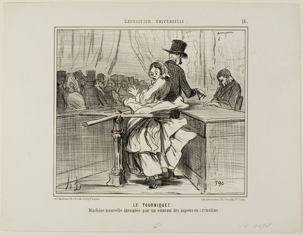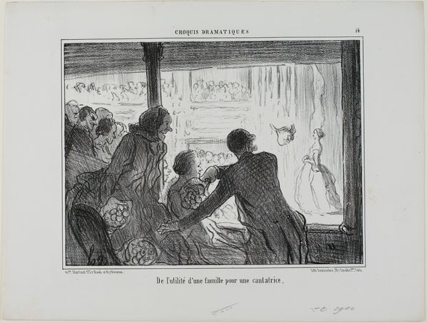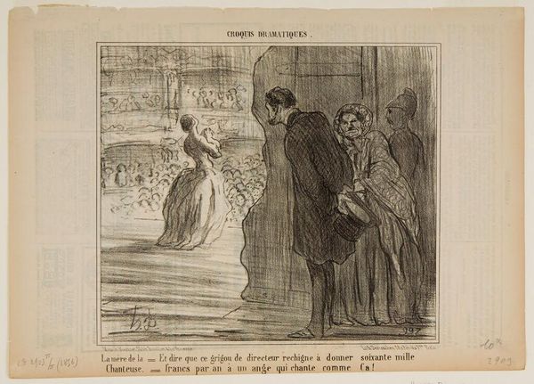 Editor: Here we have Honoré Daumier's lithograph from 1857, titled "The Week Before The Opening Of The Art Exhibition. Chorus: '- courage, let's finish the work! That's what friends are here for,' plate 399 from Actualités." It's a chaotic scene, and honestly, it feels a bit satirical. What catches your eye in this print? Curator: What immediately strikes me is how Daumier critiques the art world through this seemingly simple image. He presents a slice of 19th-century Parisian life, yes, but he's also holding a mirror up to the frantic, often performative nature of artistic creation and the pressures artists faced leading up to major exhibitions. The lithograph depicts the pressure of productivity, and that rings true today, don't you think? How much has really changed about art-making? Editor: That's a really interesting perspective! I was focused on the frantic energy of the scene and hadn’t thought about how it comments on the pressure of the art world. I guess the desperate feeling of rushing to meet a deadline is pretty universal, even now. Curator: Exactly! And the role of camaraderie and mutual support – 'courage, let's finish the work! That's what friends are here for!' suggests how networks and shared struggles bind the artists in society. Consider how societal forces might promote that sort of individualism that drives the creative world to such frenzy, a concept that surely translates across time and art contexts. Editor: I'm seeing so many more layers now than I did initially! It's not just a snapshot; it's a social commentary. Curator: Precisely. By contextualizing Daumier's work, it provides a basis for thinking about issues such as social justice and economic pressures which impact marginalized voices within art. What do you take away from thinking about this context? Editor: It makes me want to delve more into Daumier's broader body of work. I hadn’t considered the historical, social, and even political undertones. Thanks! Curator: My pleasure! This work invites us to investigate historical narratives, not in isolation, but as a critical dialogue with the pressing issues of our present.
