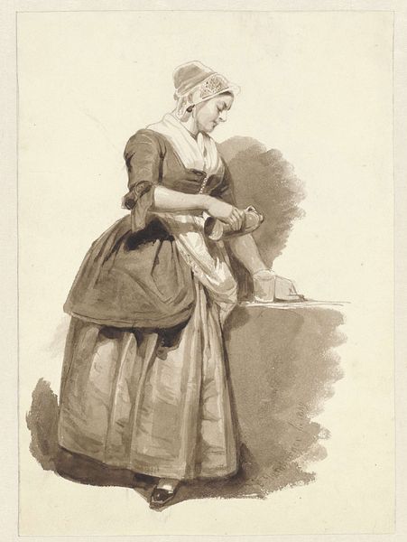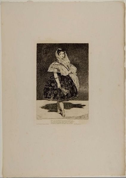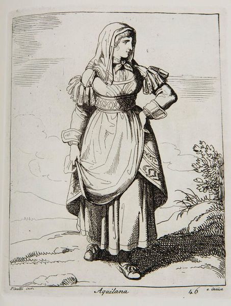 Curator: This is “La Pasiega,” an 1838 engraving by Rosario Weiss Zorrilla. The lines are so delicate for a print! What strikes you most about this piece? Editor: It's the woman's clothing. The detail makes me think about where and how she obtained it and, moreover, who had to make this attire? How much labor went into producing and maintaining this outfit? Curator: Excellent question! Consider the social context in 19th-century Spain. Genre paintings like these catered to a growing bourgeois interest in representations of the working class and rural life. Look closely. Do you see how the process of creating and distributing prints made images like these accessible to an audience who would consume, collect, and, ultimately, possess it? Editor: Yes, it democratized the image. But how did the means of producing engravings, specifically, impact the final work and its meaning? Was Zorrilla's technique viewed as inferior to painting, considered more of a craft? Curator: Precisely. Weiss, as a female artist, likely faced constraints in accessing formal training and recognition. Engraving, while demanding great skill, was often perceived as a more reproductive than original art form. And she must navigate expectations in a patriarchal structure. The line between art and craft becomes blurred when considering the gendered labor involved. Isn’t it remarkable that what seems to be a typical image of a woman tells such an extensive story about the time? Editor: Definitely, considering the artist's own position and constraints opens a lot of other avenues to think through! This new way of analysis changed my perspective of the artwork, thank you. Curator: A materialist lens redirects us toward those undercurrents. I think I now see a lot more nuances in seemingly simple portraits such as this one!