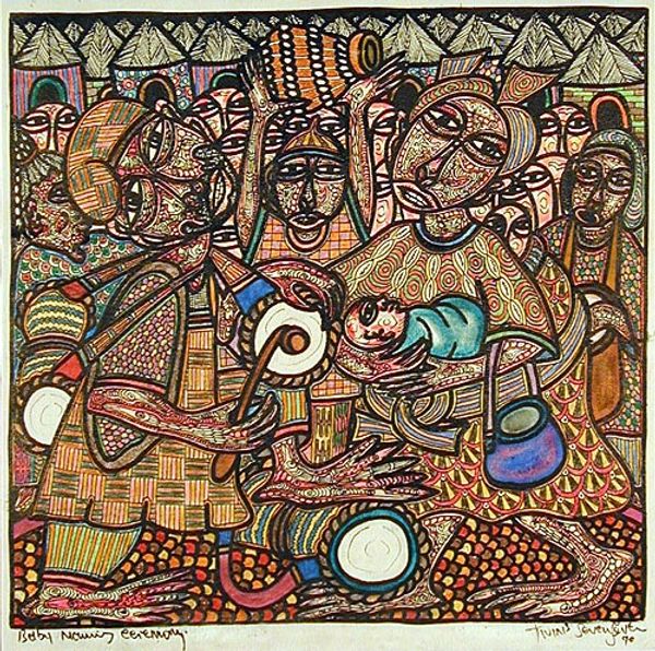 Twins Seven Seven created "Arugba Osun" using an array of vibrant colors and bold outlines, composing a scene teeming with figures and symbolic objects. The visual texture, achieved through intricate linework and pattern, evokes a sense of ritualistic energy. Seven Seven employs a dense, almost claustrophobic composition, challenging Western notions of spatial perspective. The figures, rendered in stylized forms, are interconnected through a network of lines and colors, creating a flattened picture plane. This challenges fixed meanings, inviting the viewer to decode the symbolic language embedded within the artwork's structure. Ultimately, "Arugba Osun" functions not just aesthetically but also as a complex cultural statement, reflecting the artist's engagement with Yoruba mythology. It's a dynamic site where tradition and modernity converge, prompting ongoing interpretation.