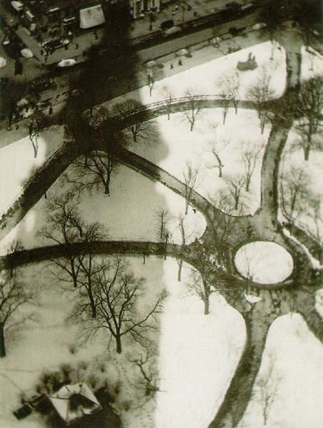 This photograph, “From the Viaduct, New York,” by Paul Strand, presents us with a world seen through light and shadow, a dance that feels so immediate. Strand seems to be searching for a new way to see, reducing the city to a play of geometric forms. Look at the grays, how they almost flatten the space! The shadows of the viaduct create a web across the scene, and you can almost feel the gritty texture of the pavement. Then, there are those two figures, standing on the edge, like afterthoughts. It's like they're caught in the act of observing, just as we are. That circular form too, what is it? Is it a plate? A stain? Strand's work, like that of his contemporary Alfred Stieglitz, challenges us to find beauty in the everyday, to see the modern world with fresh eyes. And maybe that's what art is all about – finding new ways to see, and to feel, the world around us.