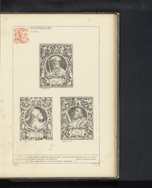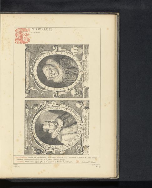 Curator: Here we see a reproduction of two prints titled, "Reproductie van twee prenten van de engel Gabriël en van Maria omringd door grotesken, door Johannes Wierix." The artwork probably predates 1880 and it features the likenesses of angel Gabriel and Mary in meticulously detailed engravings. Editor: Immediately, I’m drawn to the tight compositions. The engravings appear boxed in, almost claustrophobic, given the surrounding grotesques. Is this a reflection of the artistic conventions of the time or does it intentionally limit the divine? Curator: That's an insightful question. I see those grotesques as more than mere decoration; they form a liminal space. Grotesques, derived from rediscovered Roman art, were used during the Renaissance to blend pagan imagery with Christian themes. Their presence here might be a deliberate attempt to situate the divine within a broader cultural narrative, accessible yet transcendent. Editor: Yes, they function as cultural bridges! Structurally, the symmetry is undeniable—two mirrored images, text enclosed in circular forms. The framing elements have a near obsessive level of fine, almost obsessive detail. I suppose those circular insets that border each engraving give structure but also echo classical coins or medallions. Curator: Precisely, and those classical allusions root these religious images within the cultural memory of the time, elevating the work's meaning beyond a simple depiction of the Annunciation. Think of the psychological effect, associating the familiar with the revered, solidifying beliefs through established visual tropes. Editor: That attention to symmetry and detail emphasizes order and balance, almost as if trying to visually convey a sense of divine harmony and precision. The artist almost completely restricts tones: a series of very precisely executed, almost mechanical strokes produce both figuration and a kind of deep contrast within restricted range. It appears so self-contained! Curator: It's a controlled explosion of meaning, isn’t it? The image is filled with the kind of symbolism people knew like their ABCs; it spoke to something deep inside them. I agree with you, a world into itself. Editor: The work does transcend its medium, suggesting a visual harmony constructed meticulously through contrast. I leave this work considering those concentric textual orbs, which suggests an artistic system striving for both harmony and precision. Curator: It does show you how symbols are constantly recycled, refreshed, renewed; it can all happen right on the surface of a single artwork, and also reach deep into both our personal and shared experiences.