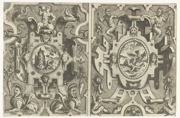 Pieter van der Heyden created these "Two Evangelists" sometime in the 16th century, using the intaglio printmaking technique of engraving. This process involves meticulously incising lines into a metal plate, which is then inked and pressed onto paper, creating a reversed image. The stark contrast of light and shadow achieved through engraving is critical to the overall effect. Van der Heyden’s skillful application of this method allows for incredibly fine detail, which is then complicated by the symmetry of its composition. The result gives us texture and form, while also imbuing the prints with cultural and artistic significance. Engraving demanded a high degree of skill, combining technical precision with artistic sensibility. It allowed for the relatively quick reproduction of images, playing a crucial role in disseminating ideas, artistic styles, and religious beliefs across Europe. The labor-intensive nature of engraving highlights the value placed on skilled craftsmanship during the Renaissance. Ultimately, understanding the materials, making process, and cultural context deepens our appreciation of this artwork, moving beyond traditional distinctions between fine art and craft.