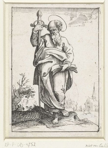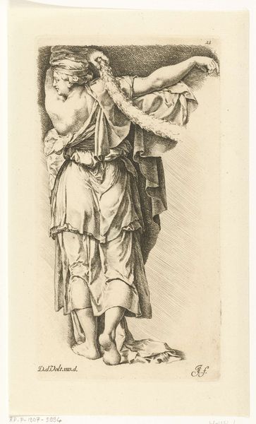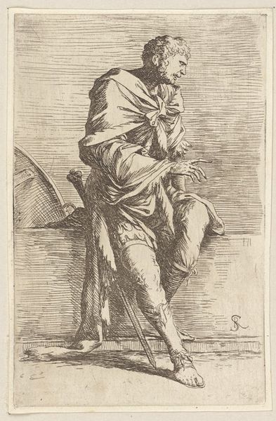 Editor: This drawing, "Man, Standing, His Arm Pointing Horizontally," made with ink and pen by Salvator Rosa around 1656-1657, has a surprisingly theatrical air about it, don't you think? The figure’s pose is so declamatory. What do you make of it? Curator: It certainly commands attention, doesn’t it? Rosa was deeply engaged with the theatre and performance culture of his time. He moved in circles that debated poetry, drama and music. His work wasn’t simply about depicting a person; it was often about conveying a character or a moral message for a specific, knowledgeable audience. Editor: So, the theatricality is intentional? Is he portraying someone specific? Curator: Perhaps, or maybe it is an ‘everyman’, a representation of a stock character like the 'philosopher' or the 'soldier' then popular on stage. Consider where these kinds of images would be viewed, in print form, circulated among fellow artists and collectors interested in understanding these characters or how they ought to be portrayed on stage. Editor: That's interesting, the idea that this could be circulated and serve as reference for theatrical representation, how a ‘soldier’ ought to be. Do you think the exaggerated pose is also influenced by specific conventions? Curator: Exactly. Look at how his draped clothing creates a sense of movement, drawing the eye along the direction he's pointing. It may also draw the viewer’s eye around and outside of the depicted drawing to continue the ‘scene’ imaginatively in the world around them. The act of pointing becomes almost aggressive, commanding the gaze and perhaps even shaping behavior. Editor: So it’s less a portrait, more of a statement on power and performance. It's fascinating to think about art directly informing popular culture in that era. Curator: Precisely. Rosa was crafting a visual language that was meant to resonate with, and perhaps even subtly influence, the social discourse of his day. Art was far from passive.