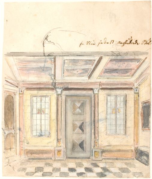 Curator: What a quietly elegant space! It’s got that feeling of poised expectation, like it's holding its breath. Editor: Yes, precisely! I feel like I could waltz right into that room. Now, what are we looking at exactly? Curator: This is "Drawing of an Interior: Salon" created around 1850 by an anonymous artist. It’s a pencil and watercolor piece currently residing here at The Met. The rendering, through the subtle blending of mediums, evokes so much more than just simple architectural record, no? Editor: Absolutely. There's a distinct softness. The colours are restrained, but deliberate – a little pop of red here, a smudge of blue there. The light streaming in suggests a late afternoon… What stories do you imagine within these walls? Curator: Given the likely social and political context of its time, I wonder what the artist seeks to reveal. Whose gaze is reflected by this rendering of wealth? Is it merely documentary, or does this echo of power and status present commentary? This seemingly empty space speaks to the narratives it could contain. Editor: You’ve sparked my imagination. It makes me want to get into the heads of the absent characters. Were the inhabitants wealthy elites navigating complex social norms, perhaps stifled by convention even within the beauty of this carefully crafted setting? Or something simpler? Perhaps this space provided freedom, creativity? I keep thinking this particular Salon may conceal forbidden liaisons! Curator: Indeed. The room is decidedly unfurnished, save for its architectural details, its decorative trims, and carefully rendered, tiled floor. It gives us freedom to place within it a wealth of possibilities, of differing degrees of comfort and tension. But why only suggest a setting? I suppose my impulse would be to better understand whose stories were considered unworthy of such rendering. Who did the walls not serve? Editor: I’m certain we could sit and wonder for days about such a humble, empty room. Its simplicity seems almost confrontational in the present day, somehow... Anyway, whatever one thinks of what’s contained – or not contained – it makes you wonder what a room is truly "for", right? Curator: Absolutely. These interiors prompt questions around domesticity and status… The tension in this work remains fascinating precisely because it is not fully stated, leaving much to interpretation and debate. Editor: Exactly!
