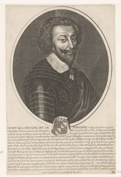 Curator: This engraving is titled "Portret van Wilhelm Salentin von Salm-Reifferscheidt," created sometime between 1590 and 1634 by Jacob van der Heyden. Editor: The texture created in the armor and lace is quite compelling. I imagine the production required some talent. The stark contrast evokes a sense of formality but with the eyes peering out it does feel a bit haunting, doesn't it? Curator: The textural elements are fascinating here. It is critical to consider the techniques necessary for production. This required meticulous work; each line on the copperplate needed precise cutting and it showcases skill, labour, and attention to detail. I wonder if any workshop assistants aided Jacob Van Der Heyden. Editor: And surrounding Wilhelm is all this circular text and that ornate heraldic crest. To me these act like protective emblems, markers of his status but also shields against an unknowable future. Curator: Precisely! The heraldry, as a symbolic element, demonstrates wealth, nobility, and ancestry—visual representations of economic and social status. I think the print, reproduced and disseminated, served the interests of class affirmation through material means. Editor: Yes! It solidifies lineage. But think, too, of the man himself. His slightly smug expression gives the entire scene a psychological layer of self-assuredness, as though daring us to question the symbolism surrounding him. I do find his moustache charming, although the Baroque style does seem a bit ridiculous. Curator: Perhaps he had it shaped that way to emphasize social position. Regardless, our discussion underscores how this artwork is a physical object, created and distributed within a specific cultural context, thus prompting meaningful inquiries. Editor: And by examining Wilhelm’s symbolic armor and heraldry, we decode layers of emotional depth and historical understanding of both class structure and familial identity.