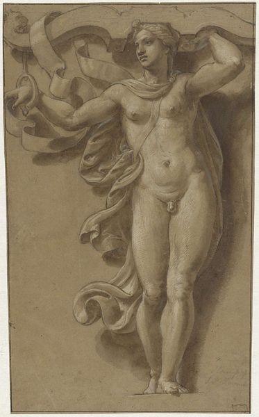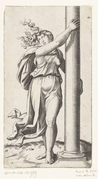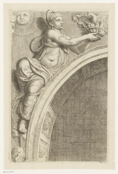 Curator: This is a print showing a relief designed by Hubert Quellinus, titled "Relief with personification of the element Fire above arch in the Burgerzaal of the Stadhuis on the Dam," dating between 1663 and 1783. It's currently held at the Rijksmuseum. What strikes you about it initially? Editor: Well, it’s quite striking, really. The figure dominating the composition almost bursts out, doesn't it? The texture created through the engraving gives it this immense dynamism. Almost feels a little rebellious with that spiky hair. Curator: It does. Quellinus, and the unknown engraver who made the print, captured that baroque energy perfectly. Considering it was designed for the Burgerzaal, the heart of Amsterdam's city hall, what socio-political context might have shaped such a representation of Fire? Editor: Given Amsterdam's rising global influence during that period, I read it as a deliberate assertion of power. Fire is both destructive and transformative. It could be about harnessing internal forces, of industry and innovation that drove their empire, or warning of danger. The lizard below is surely symbolic. It smacks of dangerous alchemy. Curator: Precisely. The Stadhuis itself was a carefully constructed message, a testament to Amsterdam’s civic virtue and global reach, projecting wealth. To place an active and slightly unkempt fire deity here seems calculated. How might that contrast with the expected decorum? Editor: Well, consider other depictions of fire as hellish or destructive and link it to societal anxieties about morality, authority. But this image, through its integration into the architecture, seemingly claims even destructive elements for civic purposes. An attempt to reframe perception for colonial interests? Curator: It reflects an intriguing relationship with ideas of control and the elements, yes. Also, note how the arch frames nothing. This personification isn't about *overcoming* the doorway—it *is* the threshold. Editor: Yes, interesting— the figure seems caught between worlds, or, perhaps, presiding over them both. This single engraving is brimming with complex meanings about civic and even personal power. A really engaging look into Amsterdam's ambitions. Curator: Indeed, an exercise in harnessing symbols for asserting a controlled yet vibrant civic image. Thanks for lending your activist insight to reveal some of these cultural tensions behind an amazing relief and engraving.