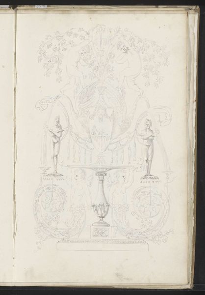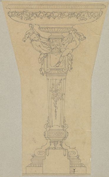 Editor: This is a nineteenth-century ink drawing, "Design for a Compote Dish," currently held at the Metropolitan Museum of Art. The detailed ornamentation gives it an almost opulent feel, even in this monochrome sketch. What strikes you most about this design? Curator: I'm intrigued by how this design speaks to the complex relationship between art, craft, and social class in the 19th century. The compote dish itself signifies a certain level of bourgeois domesticity, a space where social rituals were performed. What does this elaborate design tell us about the aspirations and values of the people who might have used such an object? Editor: It feels very excessive! Was it common to see such extravagant designs in functional objects? Curator: Exactly! The extravagance raises questions. Was this design meant for production, or was it a more aspirational statement? And who was it designed for? The rising middle class was eager to display wealth and status, often mimicking aristocratic aesthetics. However, this level of ornamentation could also represent a rejection of industrial standardization, a desire to return to individualized craftmanship as a form of resistance against mass production. Editor: So, the design reflects both embracing and rejecting the social structures of the time. Curator: Precisely. It encapsulates the tensions between embracing upward mobility and critiquing the systems that made it possible. Do you think that tension comes across in the artwork itself? Editor: Definitely. Seeing it as more than just a decorative object helps unpack a broader narrative about class and aspiration. Curator: Indeed. It invites us to consider the object's potential role in shaping and reflecting social identities and power dynamics. I think I see it in a new way too!