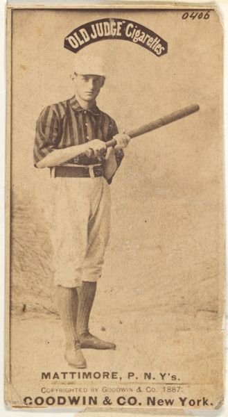 This small chromolithograph, made by Goodwin & Company in the late 19th century, presents a baseball player, Crooks, from the St. Louis Whites. Rendered in muted sepia tones, the composition balances portraiture with advertising. Crooks, positioned slightly off-center, holds a bat, his gaze directed towards an unseen pitch. The artist has created a visual hierarchy through contrast, with the player's figure slightly darker against a lighter background, drawing our attention to the baseball player. The background is sparse, suggesting an outdoor field. The card subtly integrates commerce with sport. The inscription, "Old Judge Cigarettes," anchors the image, linking the athletic prowess of Crooks with the brand. This juxtaposition of athleticism and smoking creates a tension, reflective of the era's evolving attitudes towards health and leisure. The formal tension embodied here underscores the complex interplay of culture, commerce, and representation inherent in this seemingly simple baseball card.
