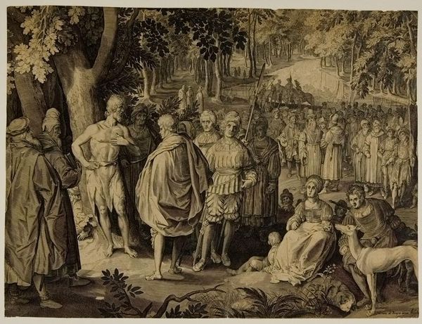 Editor: This is "Holy Orders" by Jean Pesne, created sometime between 1623 and 1700. It's an engraving, and the composition feels very classical with the figures arranged in a balanced way. What do you see in the way the lines and forms contribute to the overall structure? Curator: The composition is certainly deliberate. Observe how Pesne uses line to define and separate forms, creating a clear distinction between the figures and the architectural backdrop. Do you notice how the light and shadow interplay to create depth? Editor: Yes, the contrast really emphasizes the texture of the robes and the solidity of the buildings. It gives a sense of weight and presence. Curator: Precisely. And consider how the central figure, with the raised hand, becomes a focal point through the convergence of lines and the tonal contrast. A clear hierarchy of forms reinforces the narrative. Editor: I see what you mean. It's all carefully constructed to guide the eye and emphasize the meaning, whatever that may be. Thanks!