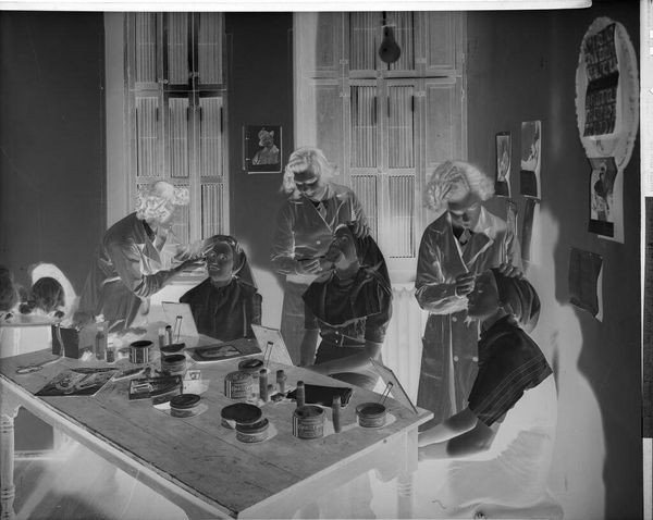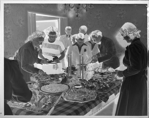 Editor: This is an untitled photograph by Lucian and Mary Brown, taken sometime in the 20th century. The negative image really emphasizes the textures, especially the food on the buffet table. What structural elements stand out to you in this composition? Curator: The stark contrast between light and dark creates a compelling rhythm. The formal arrangement of figures around the table directs the eye to the central act of serving, almost like a stage. Notice the repetition of shapes – the round plates, the faces, even the floral wallpaper. Editor: That’s interesting. I hadn’t considered the repetition. Curator: The geometric relationships between these elements create a sense of order. Editor: I see how the image is carefully constructed. I learned a lot from this analysis. Curator: Indeed, examining the inherent qualities reveals much about its impact.
