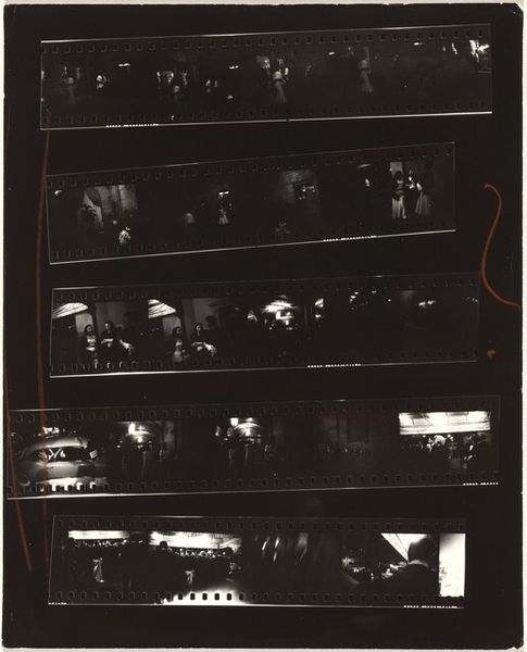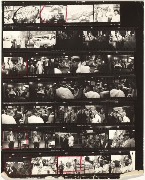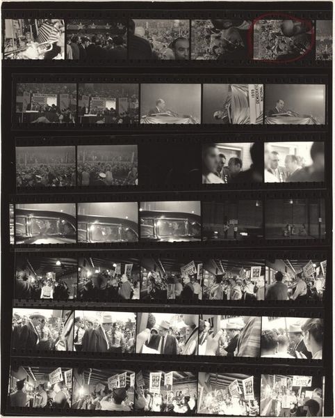 Curator: So, we have before us Robert Frank's gelatin-silver print titled "Delegates, convention hall--Chicago," captured in 1956. What strikes you about it right away? Editor: It feels...claustrophobic, almost oppressive. So many faces, all looking in roughly the same direction, and yet it’s hard to read any genuine connection between them. And those hats, "Harriman," plastered across them. It’s a sea of conformity, ironically proclaiming a name. Curator: The "Harriman" hats definitely add a layer of symbolism. In that era, political conventions were carefully orchestrated displays of party unity. These hats act almost like badges, denoting allegiance, submerging individual identity. Editor: Yes! And the grainy quality of the black and white intensifies that feeling, as if the picture is somehow revealing the process to be a little bit suspect and overly contrived. It lacks transparency in a world of media. Curator: Frank was very much interested in capturing the undercurrents of American society, and frequently challenged its more simplistic narratives. He moved around in the crowds as a visitor or stranger, and yet took shots from within, making it even more realistic and capturing these "decisive moments". Editor: I see the photograph being about surface and depth. Those clean portraits in the back contrast heavily with the common attendees on the convention hall. And speaking of undercurrents, the high contrast really draws my eye. Are we supposed to consider how class and access factor into it? The darkness around each of these folks in the crowd makes you think that it would be a sad state of affairs being one of them, forced to be a Harriman! Curator: That tension between surface appearances and deeper truths is absolutely central to Frank’s project. This photograph does have some ambiguity: do these attendees participate out of choice, obligation, both? Editor: Well, it certainly is quite the period piece. Overall I like the chaos depicted with such a stoic color palate, it helps elevate the importance without losing the message. What would you want folks to take away? Curator: I'd hope viewers would contemplate the nature of political participation, the role of individual versus collective identity, and whether public displays truly reflect private convictions. Frank holds up a mirror to American democracy, reflecting both its aspirations and its contradictions. Editor: Yeah. I dig it. It definitely is doing more than its surface lets on! I can tell. It seems like Frank managed to leave an everlasting cultural artifact that depicts his moment as clearly as ever.