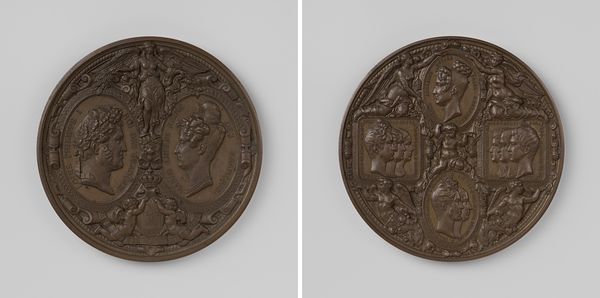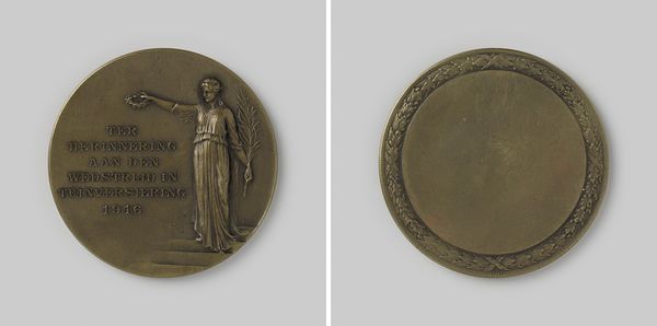 Editor: Here we have the "Genees- en Heelkundig Genootschap te Amsterdam," a bronze relief from 1840 by Moses de Vries. My first impression is one of classical revival, the nude figure really grabs your attention. What do you see in this piece, particularly concerning its imagery? Curator: What I see is a careful layering of symbolism, a conscious echoing of classical ideals married with the emerging scientific worldview of the 19th century. The nude male figure, for example, draws upon the Greco-Roman tradition, associating the medical society with the wisdom and rationality of antiquity. Editor: And what about the laurel wreath on the reverse? Is that part of the same visual language? Curator: Absolutely. The laurel is a symbol of victory, achievement, and honor. Here, it suggests the triumph of medical knowledge over disease. But notice how it encircles an empty space? What meaning might that negative space hold? Editor: Perhaps it symbolizes the endless pursuit of knowledge or new frontiers in medicine that are yet to be discovered? Curator: Precisely! And look at the caduceus— a staff with two snakes winding around it – held by the figure. Although often mistakenly used as a symbol of medicine, the true symbol of medicine is the rod of Asclepius featuring only one snake. Its presence in this relief invites us to consider evolving understanding and perhaps even the complexities, of medical symbolism. This image speaks to both the history and the future of medicine. Editor: This has really changed how I view this piece; it is amazing how much can be communicated through these visual shorthands. Curator: Indeed! Art like this bronze relief reveals how deeply cultures embed their values and aspirations within even seemingly simple images.