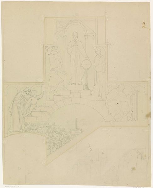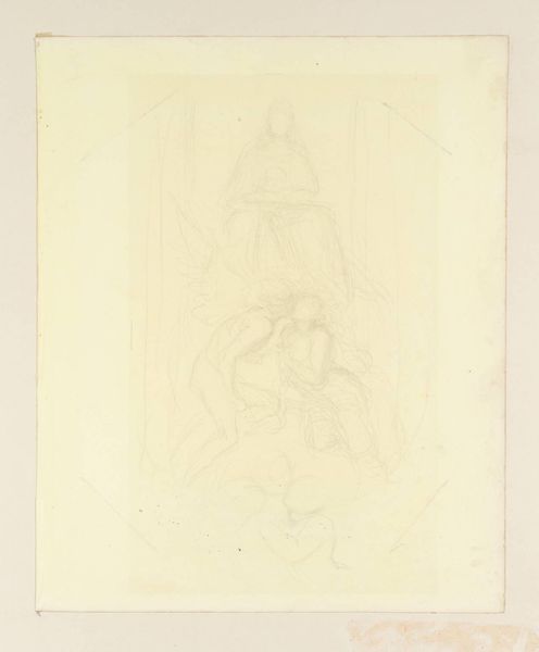 Dankvart Dreyer made this drawing, "Christ in the Mandorla Surrounded by Symbols of the Evangelists, after a Plaquette in the National Museum," using graphite. The composition immediately strikes you with its ordered symmetry. Christ is centrally located within a mandorla, an almond-shaped aureole of light, that dominates the visual field. Around this are symbols of the Evangelists which create a balanced, yet dynamic rhythm. Dreyer's approach to line is delicate and precise. Notice the soft gradations achieved through the graphite, giving volume to the figures and a subtle texture to the drapery. It’s as if Dreyer seeks to capture not just the form but the very essence of divine light and order. The drawing speaks to the enduring power of the symbolic language and its underlying structure to convey deep theological concepts. It prompts us to consider how even in a sketch, the artist can challenge our understanding, and transform a familiar scene into a new space.