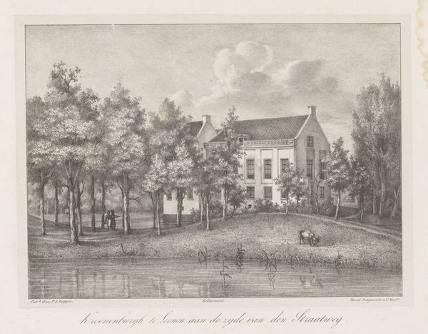 Curator: Look at this intricate engraving by Carel Christiaan Antony Last. It’s titled “View of the Cromvliet Estate in Rijswijk” and was likely created sometime between 1818 and 1876. What’s your initial read on it? Editor: Well, the immediate feel is one of placid order. The neoclassical architecture framed by those delicately rendered trees...it's all so controlled, so… composed. Almost theatrical. Do you get a sense of artificiality? Curator: Artificial in the sense that nature itself is carefully arranged to complement human structures, certainly. It echoes that neoclassical sensibility, where everything finds its rational place, its purpose. It reminds me a bit of stage design; the bridge acting as the stage, the figures posed as actors. Editor: Exactly! And the etching style – with its very precise lines – emphasizes that artificiality. But it’s not just about the visual perfection, it goes back further. Isn't the symbolism suggestive? The estate could represent something stable in contrast with chaotic modern times, almost trying to say 'This is a stable world view!'. Curator: The artist is creating, if you will, a kind of architectural memory. He offers his interpretation of this location and his vision for order and clarity for the culture he is representing. The ducks peacefully floating on the water mirror the people socializing on the bridge...every element adds to this vision of balanced contentment. But who exactly would have the money and social position to buy or visit this sort of landscape? Editor: Indeed. This kind of idealized setting sends a particular message. It silently promotes a certain idea of how the wealthy wanted to be perceived; serene, cultured, at peace within their carefully curated surroundings. Curator: Almost like branding of its time. What an evocative piece; its quiet precision holds so much about that period. It’s fascinating. Editor: Absolutely, it invites contemplation of an era through this tiny yet resonant world captured in ink.