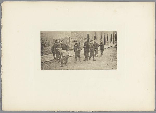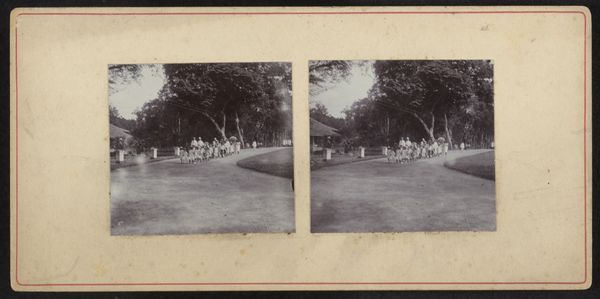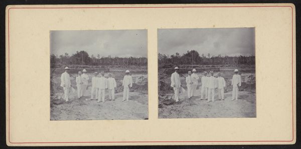 This photographic work titled, "Groep amateurfotografen (AFV) bij een clubuitje met camera's, op de voorgrond vermoedelijk Michel Ameschot" was created by H. Ameschot. The sepia tones immediately suggest a narrative fixed in time, almost faded. The composition leads us from the gathering of men to the open field in the distance, using the group as a signifier for community. The repetition of the scene side by side, typical of stereoscopic images, destabilizes our perception, asking us to reconsider the meaning of doubling. The photograph, as a medium, is inherently linked to the real, yet here it presents us with a constructed image, a performance of camaraderie. Consider the structuralist perspective, where the photograph functions as a sign, not merely reflecting reality but constructing it. It invites us to consider how photography, even in its early forms, engaged with questions of representation, reality, and the gaze.