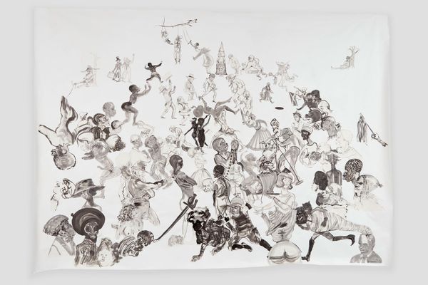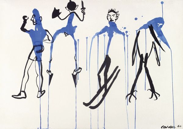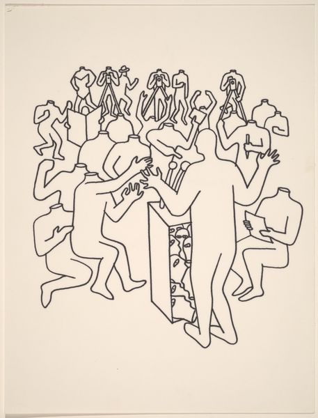 Curator: Looking at "Children’s Festival" by Tia Peltz, I am immediately struck by how festive it feels. There's a lot of movement in the scene. Editor: Indeed. And consider that the artwork seemingly rendered entirely in ink, focuses on a joyous gathering, likely some sort of public celebration or fair from the looks of the well-dressed figures in the background. I can’t help but think about who gets access to such joy and celebration and how it may influence their developmental outcomes. Curator: That's a good point to consider. It makes me wonder about the implied socio-economic dynamics within the picture. Editor: Right. Look how the children at the front are rendered with such prominence, their outsized heads emphasizing a child-centered society perhaps. Do you think that’s the point? What can we tell of that kind of society from its imagery? Curator: I agree on that observation; their gestures, their innocence even with some underlying melancholy expressed in their outsized eyes… To consider the period's historical context may offer insights, it almost reminds me of German Expressionist woodcuts... Perhaps an element of that historical influence on art creation in general is in play here? Editor: Interesting! The contrast certainly strengthens that hypothesis. Especially considering children in such finery, likely symbolic markers within that time’s rigid class strata. The setting seems to serve almost as a stage for displaying them, prompting some uncomfortable questions for the public sphere on child labor and childhood innocence at that time, particularly with postcolonialism being so prominent in recent literature and scholarship on those topics. Curator: It does carry some ominous undertones which complicate the theme! Almost akin to silent commentary when framed this way. Editor: Absolutely! This work definitely sparks conversation about public perceptions, institutions and even art’s intersectional place as a political apparatus of change and activism. Curator: Thinking more about the artist’s choice of ink – a medium both immediate and unforgiving… what does that say, for us, about this specific theme? Editor: The bold lines and stark contrasts demand immediate confrontation with themes often brushed over or idealistically portrayed and glossed. Not something often thought about. Curator: Precisely! It leaves us much to consider outside initial assumptions... Editor: Right, let's encourage viewers to seek the same complexities when witnessing moments of shared revelry themselves.
