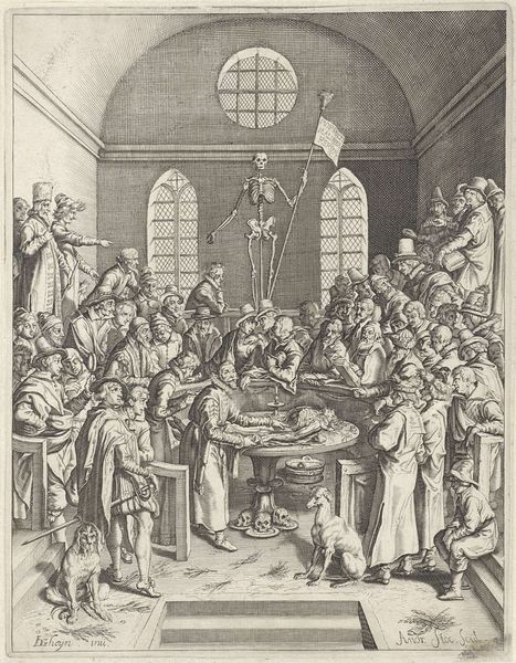 Curator: Here we have "Pesachmaal," or "Passover Meal," an engraving rendered in 1593. It resides here at the Rijksmuseum. Editor: My first impression is of constrained chaos. The figures crowd the table, and while the composition is balanced, the sheer density of the engraving gives it a restless quality. Look at the detailing in their robes, and how light and shadow compete! Curator: That restlessness, I think, speaks to the socio-political tension embedded within the work. It portrays the Last Supper through a distinctly Northern Renaissance lens, filtered through the anxieties of religious reform, anxieties about persecution, particularly for those practicing forms of faith outside the main conventions. Look at their downcast eyes; you don't feel like they believe in a 'safe' space in that room. Editor: It is fascinating to consider it in terms of materials. Intaglio prints like this were relatively accessible; they circulated widely. The means of producing images of this kind created a democratization that countered the rigid hierarchy being depicted. See how skillfully Wierix handles the gradations of tone. Even with the restricted material, there is depth and dimensionality. The cross-hatching feels almost textural. Curator: Exactly. That widespread availability matters, allowing these coded narratives to reach broader audiences. The historical context becomes interwoven with the visual. You can tell he is embedding subtle visual signifiers about communal solidarity for those that may not meet with open welcome otherwise. Editor: I agree. And I am left pondering what it must have felt like for people who practiced those "unwelcomed" beliefs in those times... Curator: To create safe places where you practice what you know you must. Editor: I find it so poignant, these early materials used to create, recreate, or just communicate at that scale.