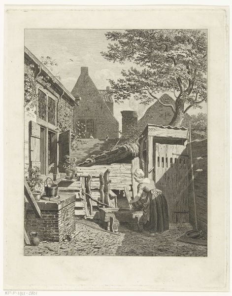 Editor: Here we have "Meisje bij een waterput," or "Girl by a Well," an etching by Cornelis Springer, created in 1843. The texture is incredible. I’m drawn to the everyday quality of it – the architecture and the lone figure. How do you interpret this work? Curator: This etching, despite its seemingly simple subject matter, speaks volumes about the socio-political landscape of the Netherlands in the 19th century. Genre paintings, depicting scenes from everyday life, gained prominence, reflecting a burgeoning middle class and a growing interest in national identity. Springer's choice to portray a commonplace scene serves to valorize the ordinary. How do you think the well functions in this image? Editor: Perhaps the well symbolizes the core of community. A necessity, drawing people together. Also, is it realism, considering the romantic and idealistic themes? Curator: Good point! Realism doesn’t appear in a vacuum. Artists, even while observing closely, were still part of a culture and often engaged with prevailing sentimental views. Looking at this as an etching—how do you think its existence as a printed work influenced who saw it? Editor: The print format democratized the artwork; allowing access beyond the elite art patrons. Curator: Precisely. And that is important to consider regarding subject matter. Springer presents a window into Dutch life intended for mass appreciation and reinforces certain values in doing so. Editor: I never considered how much the *form* influenced the *content*. The etching technique itself democratizes the scene depicted! Curator: Exactly. Every element, from subject to medium, is imbued with social and historical meaning, waiting to be unearthed.