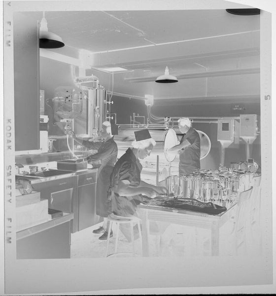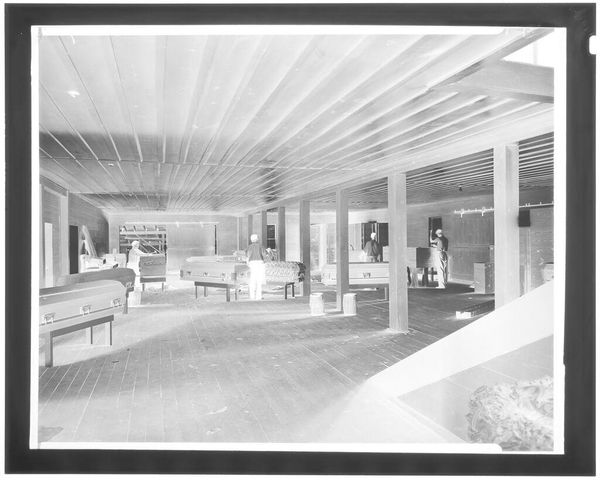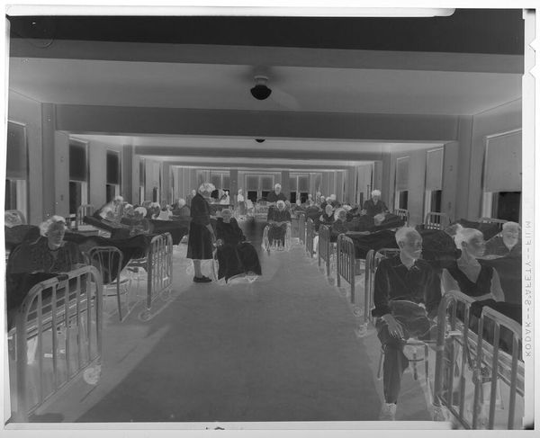 Editor: This is an untitled image by Hamblin Studio of the Elliot Hotel cafeteria. The chairs and tables give the space an oddly intimate feel. What does this photograph reveal about the means of food service and dining during its time? Curator: This image speaks volumes about the social context and labor involved in early cafeteria service. Consider the materials: the sturdy tables, the organized food display. The photograph offers a glimpse into the commodification of dining experiences and how this impacted social interactions and labor practices. Editor: That’s a really interesting point. I hadn’t considered the labor aspect. Curator: It's about looking beyond the surface to understand the processes that shaped everyday life. Seeing the cafeteria as a product of material conditions allows us to question the social and economic structures of that era. Editor: I see it now! I will definitely look at images differently from now on.