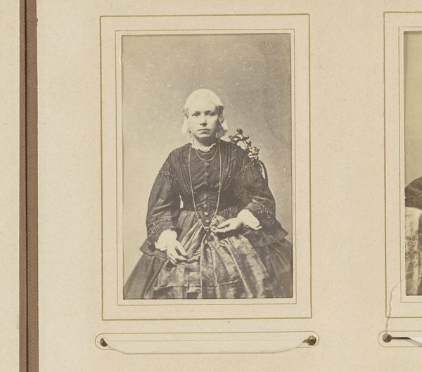 Dirk Niekerk made this portrait of a seated woman wearing a bonnet, using albumen print, a popular method in his time, on a small card. Notice how Niekerk employs a tight composition. The woman’s figure fills the frame. She is centrally positioned, her gaze direct, and she is grounded in the domestic space, suggesting a certain composure. The photograph’s monochrome palette emphasizes texture and form. The subtle gradations in tone, from the stark white of her bonnet to the dark, patterned fabric of her dress, create a visual rhythm. Yet, the meaning of this portrait goes beyond mere representation. Niekerk's careful rendering of her clothing and the surrounding environment signifies cultural codes. The woman's traditional attire, especially her bonnet, speaks to her identity, perhaps indicating her adherence to specific social or religious norms. This is a calculated display, where the sitter engages in a visual dialogue with her audience. Through the photograph’s formal elements, Niekerk thus invites us to consider how identity is constructed, performed, and communicated. This is not just a portrait of a woman; it is a study in representation, a dialogue between the individual and society.