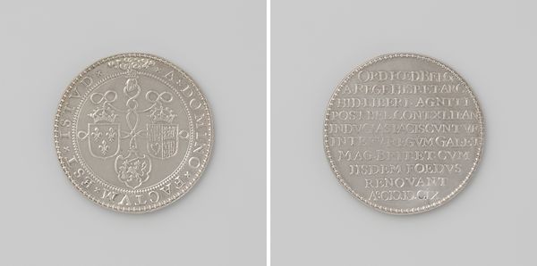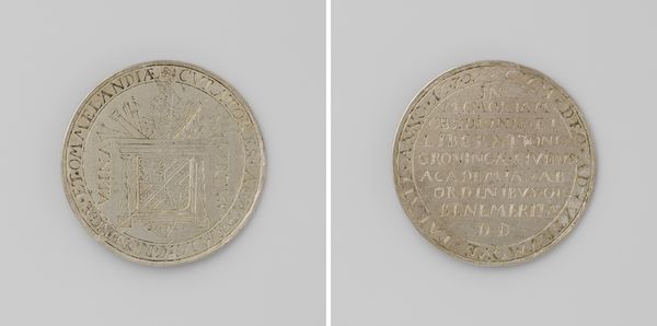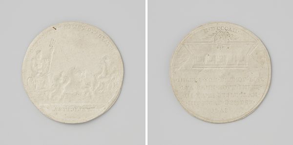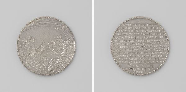 Curator: Here we have a metal print titled "Vrede van Rijswijk, ter ere van Willem III," which translates to "Peace of Rijswijk, in Honor of William III." It's dated 1697, and created by Nicolas Chevalier. Editor: The silvery surface immediately strikes me as austere and formal. Even though it's small, it radiates power. A visual encapsulation of a significant historical event frozen in time. Curator: Precisely. These commemorative prints were quite popular for marking important treaties. The Peace of Rijswijk, of course, temporarily halted Louis XIV's expansionist policies. William III, as the Dutch Stadtholder and King of England, was a key player in negotiating this peace. Editor: I notice the elaborate architectural elements – triumphal arches and ornate facades dominating one side, which gives the impression of an orderly and glorious event, as if the city is celebrating a returning hero. Then I look at the reverse, which is covered with detailed, symmetrical text. Curator: These kinds of images, though seemingly straightforward, often underwent considerable scrutiny from civic and state authorities. Remember, public image and perception were becoming ever more central to the conduct of politics. What's really fascinating is how visual elements contribute to a particular framing of peace – ordered, celebrated, triumphant. Editor: And not necessarily representative of reality. It’s interesting how the architectural motifs frame the peace itself. Buildings are strong symbols of lasting legacy, as if Chevalier’s work claims the Peace will have the same endurance. I see wreaths framing the text on the reverse as well; laurels of victory, almost. Curator: It really brings forward the role of such engravings. Consider how this piece would circulate – embedding itself into the cultural consciousness of the period, and shaping perceptions for generations to come. This kind of commemorative art was a significant instrument in constructing collective memory and legitimizing political decisions. Editor: Exactly. I mean, looking at it now, it's hard not to think about how such symbols continue to shape our understanding of power and diplomacy. You see patterns echoing through time. Thank you for sharing your perspective. Curator: Likewise, it is the symbols embedded in them that give us a more accurate insight into its lasting cultural effects.