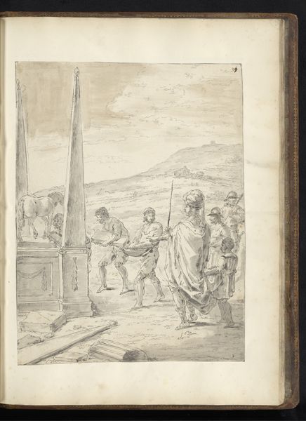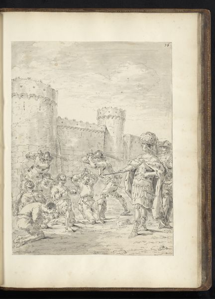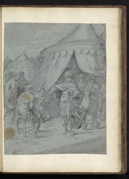 Leonaert Bramer created this drawing depicting Alexander the Great receiving sculptures from Lysippos. Observe how the artist uses a monochromatic palette to emphasize form and structure. The composition, primarily linear, directs our gaze through a sequence of carefully arranged figures and architectural fragments. Bramer employs line to delineate shape and suggest depth, creating a sense of space and perspective. The artist contrasts the detailed foreground with a more vaguely rendered background. This juxtaposition guides our eyes to the focal point. We are compelled to analyze not just what is depicted but how it is structured, encouraging us to consider the underlying semiotic system at play. The ruins might symbolize the transient nature of power. By inviting the viewer to consider the interplay between form and meaning, Bramer challenges the fixity of historical narratives. This work remains open to multiple interpretations and reflections.